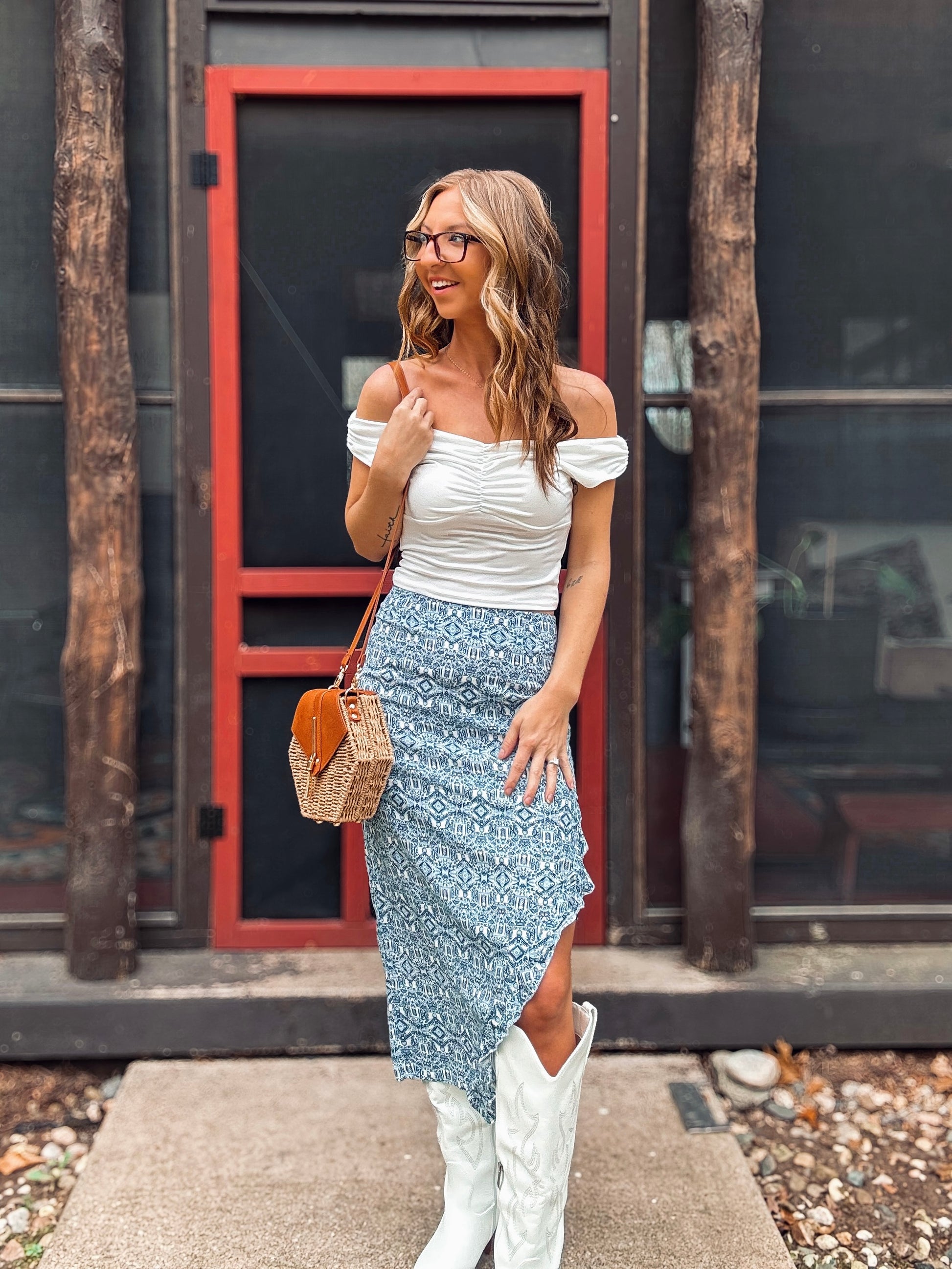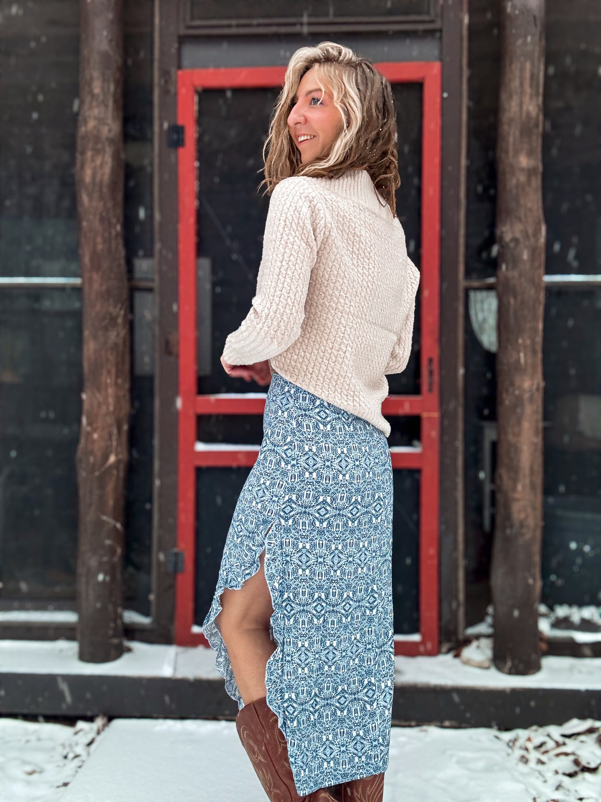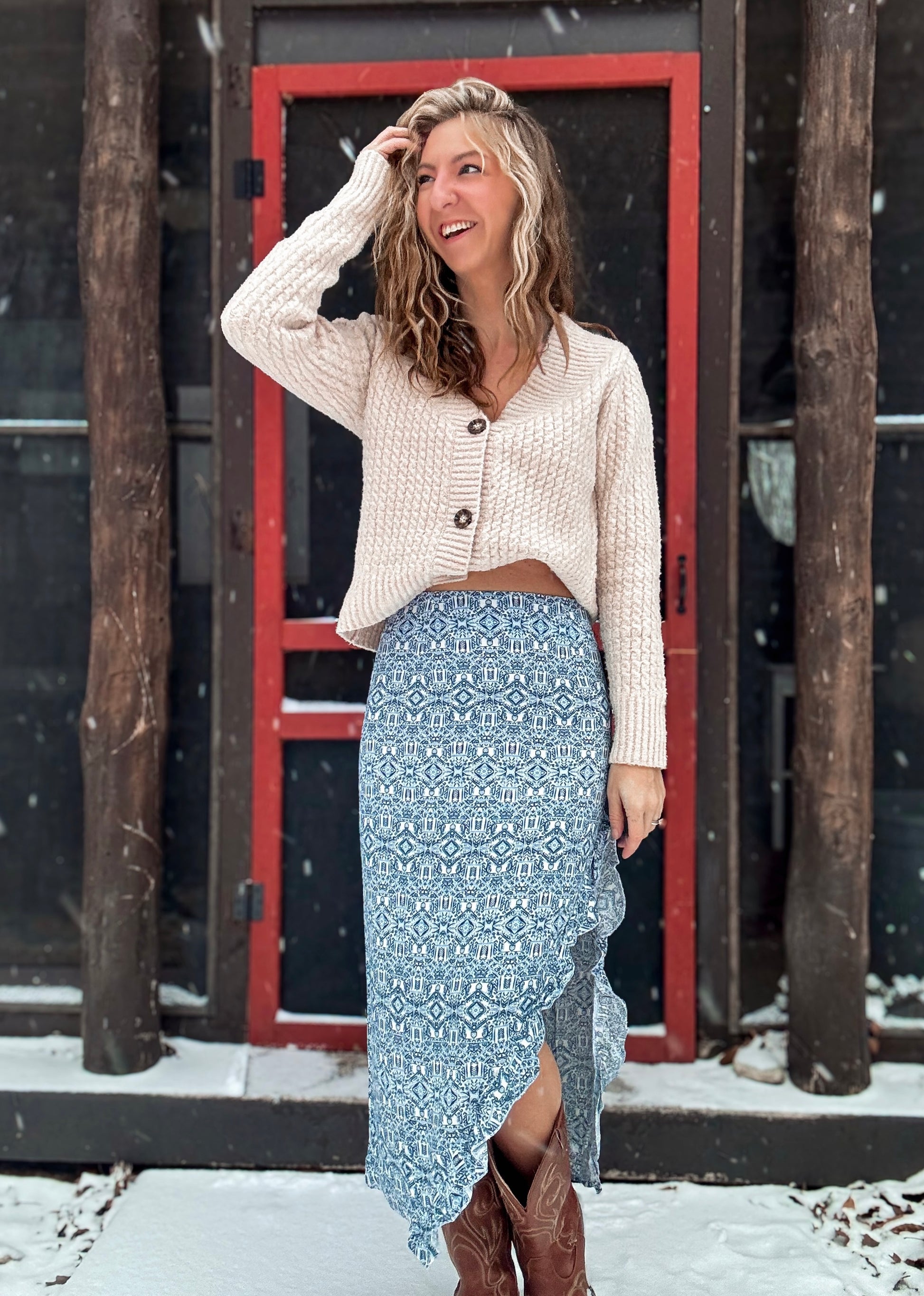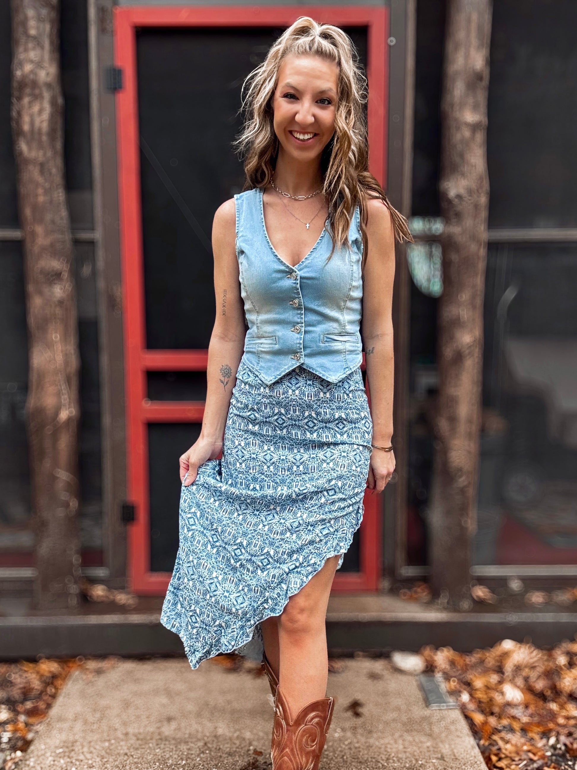 Fall in love with effortless style with this boho-inspired midi skirt, featuring an intricate blue and white geometric print. The skirt designed with an asymmetrical hem that adds movement, with the playful ruffle detail enhances its feminine charm. Perfect for warm weather or vacation looks, this versatile piece can easily be dressed up with heels or kept casual with flats. The soft, flowy fabric ensures comfort and a flattering fit, making it a standout addition to your wardrobe! 100% rayon