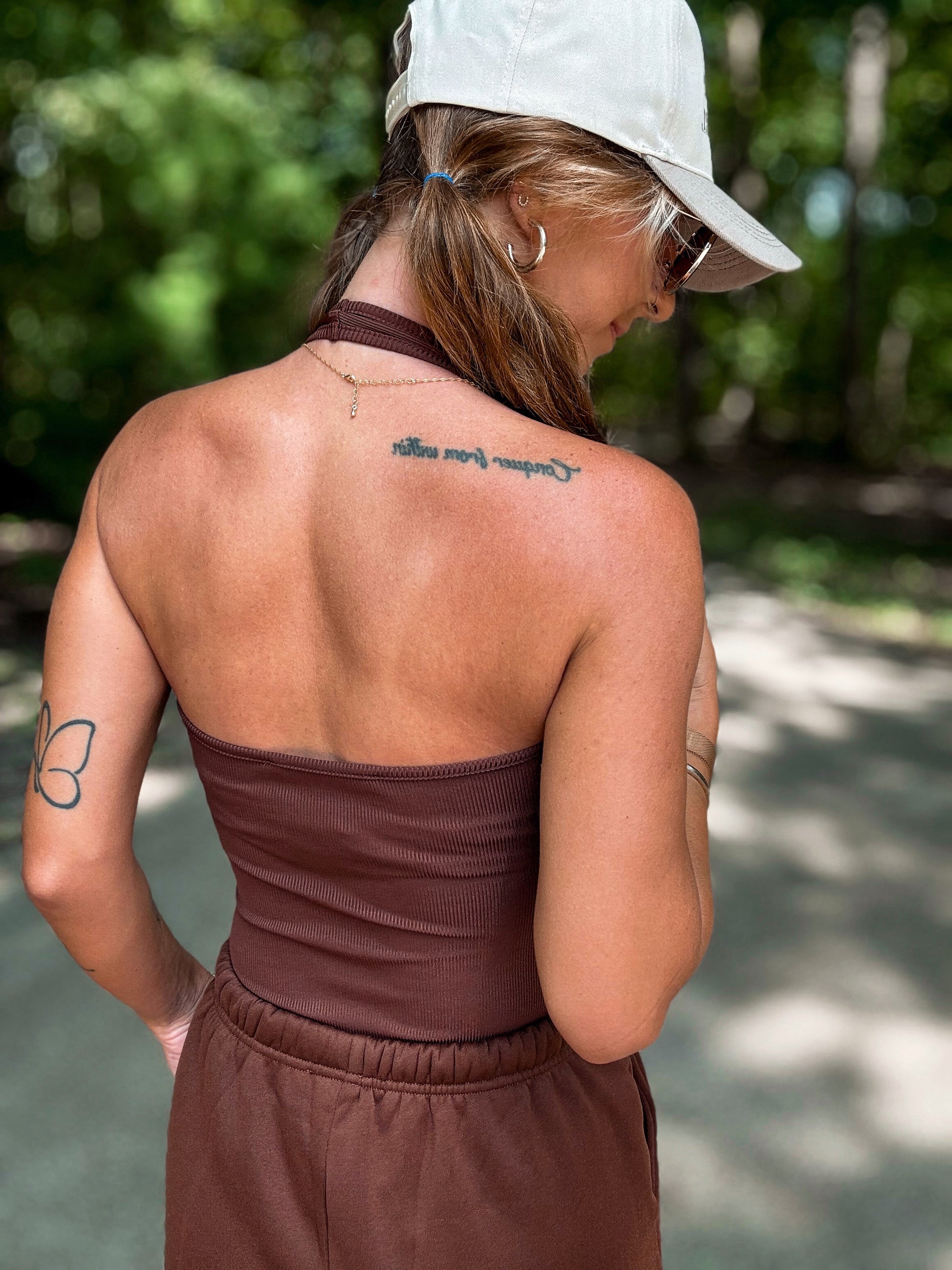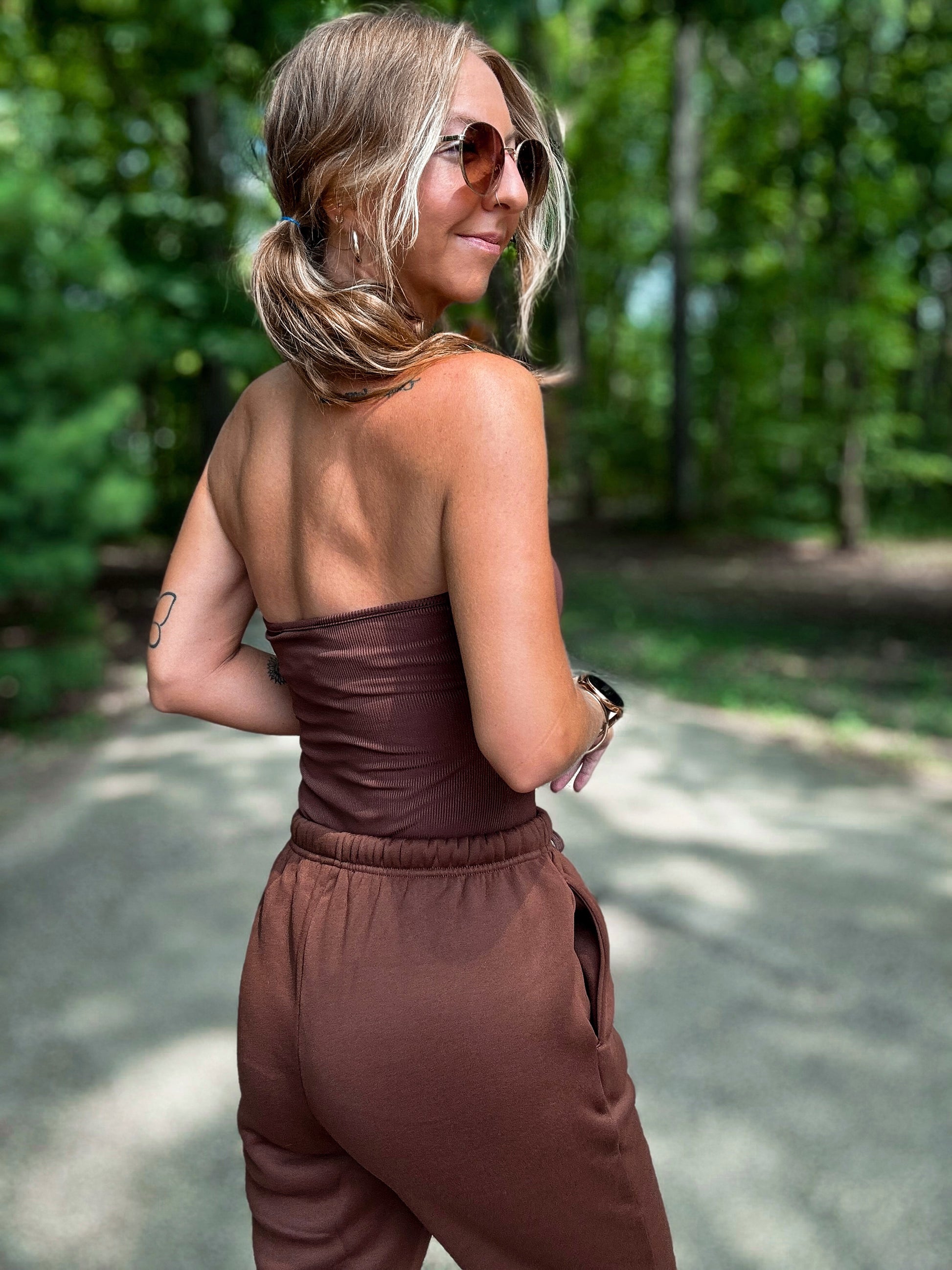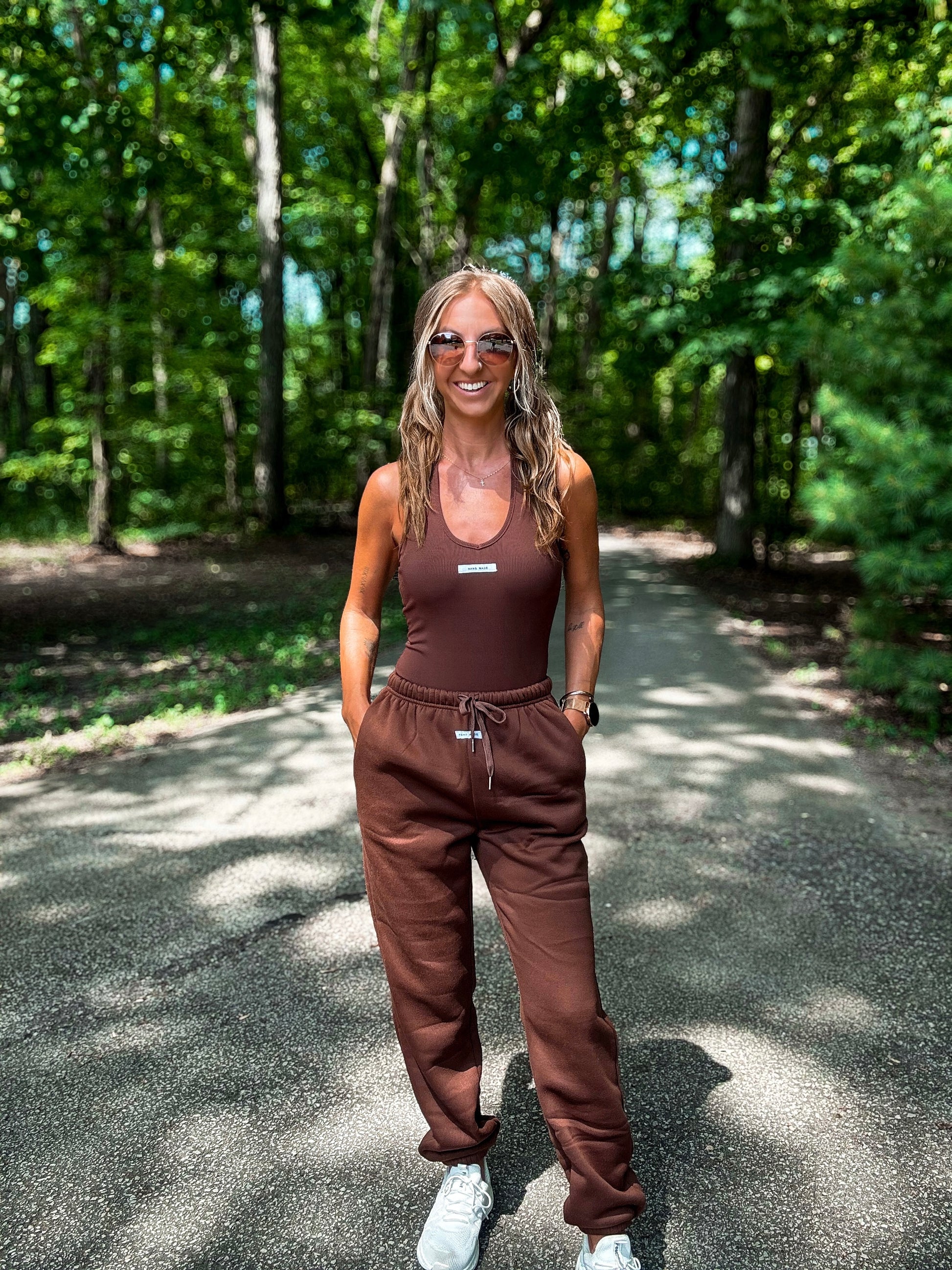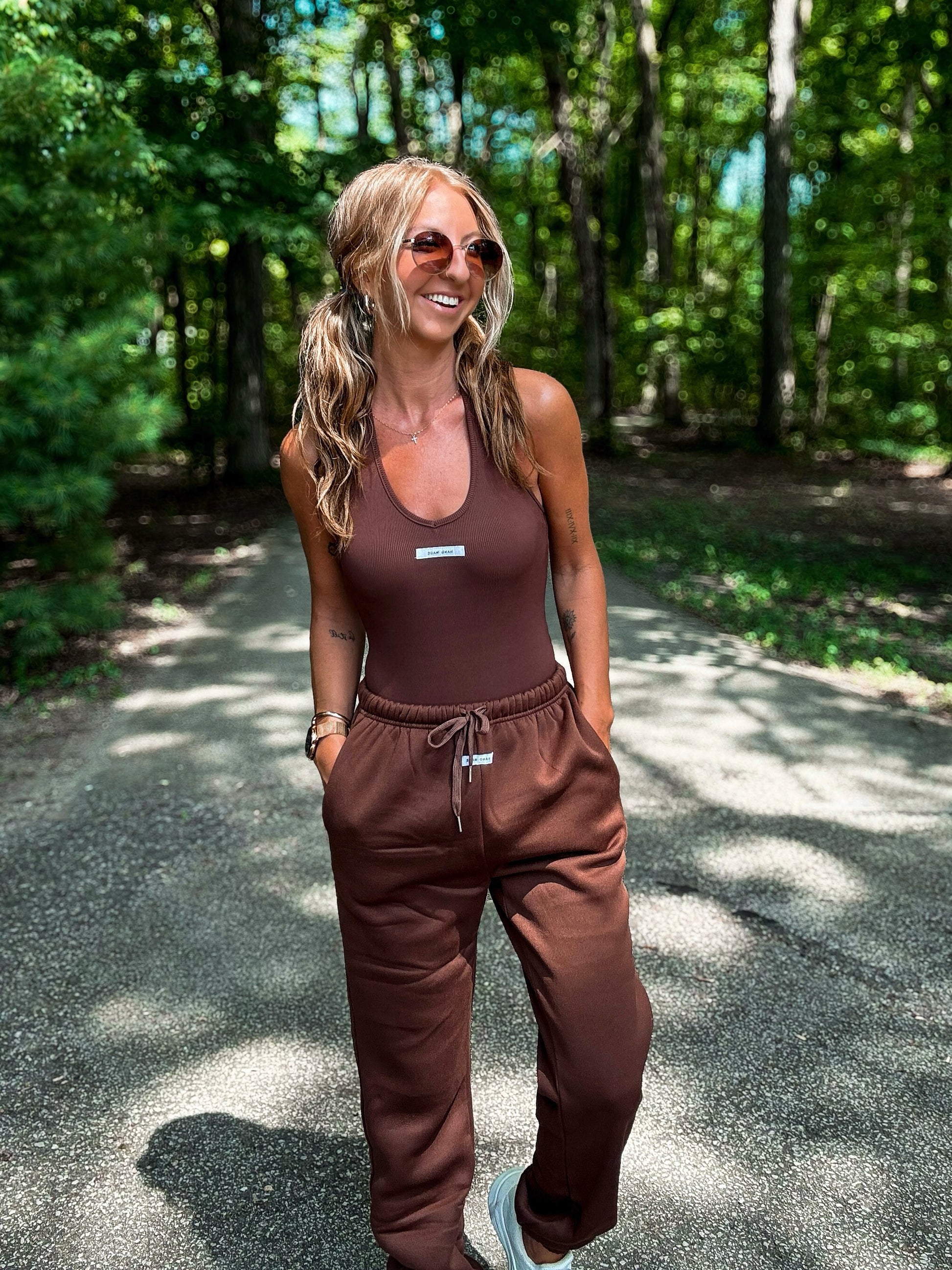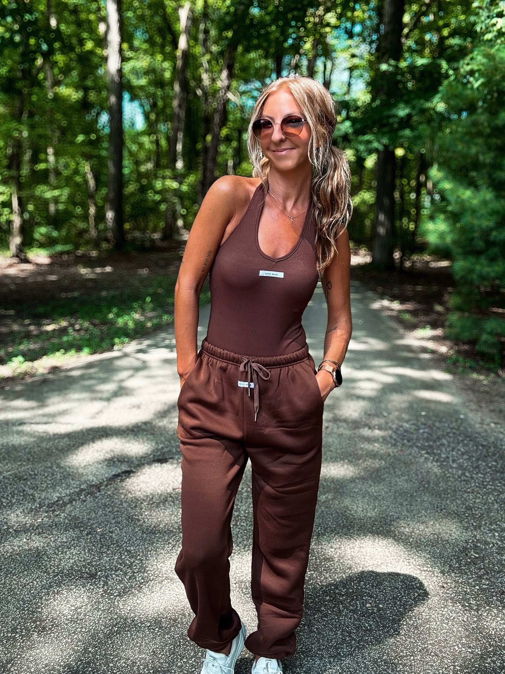 Your new go-to for looking cute without even trying. This matching two-piece set pairs a ribbed halter bodysuit that hugs in all the right places with high-waisted fleece-lined joggers made for all-day comfort. The fit is flattering, the vibe is effortless, and the minimal logo detail gives it that just-right touch of style. Wear it for errands, coffee runs, lounging, or stepping out in easy street style.