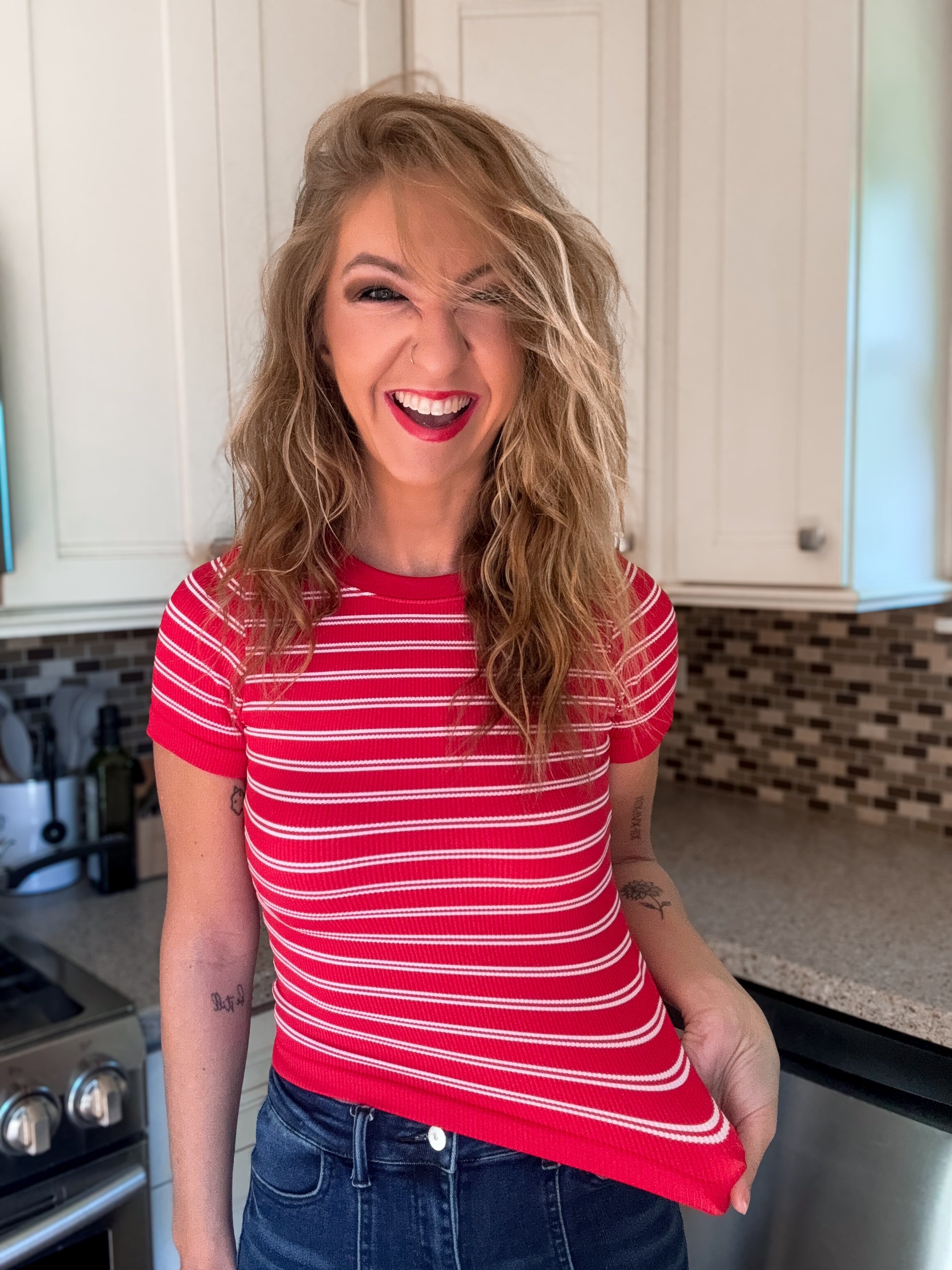 Step into bold, playful style with this Red & White Striped Seamless Top, designed with a sleek crew neckline and a flattering short-sleeve fit. Made from a super-soft stripe rib seamless fabric (66% Nylon, 28% Polyester, 6% Spandex), it stretches comfortably while keeping its shape all day long. The seamless construction gives it a smooth, second-skin feel—perfect for layering, lounging, or adding a pop of color to any outfit. Lightweight, breathable, and full of personality, this is your new go-to stripe moment.