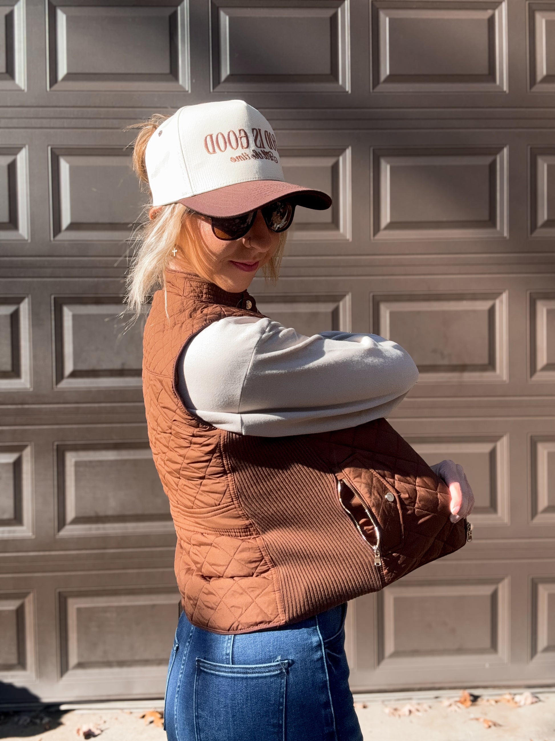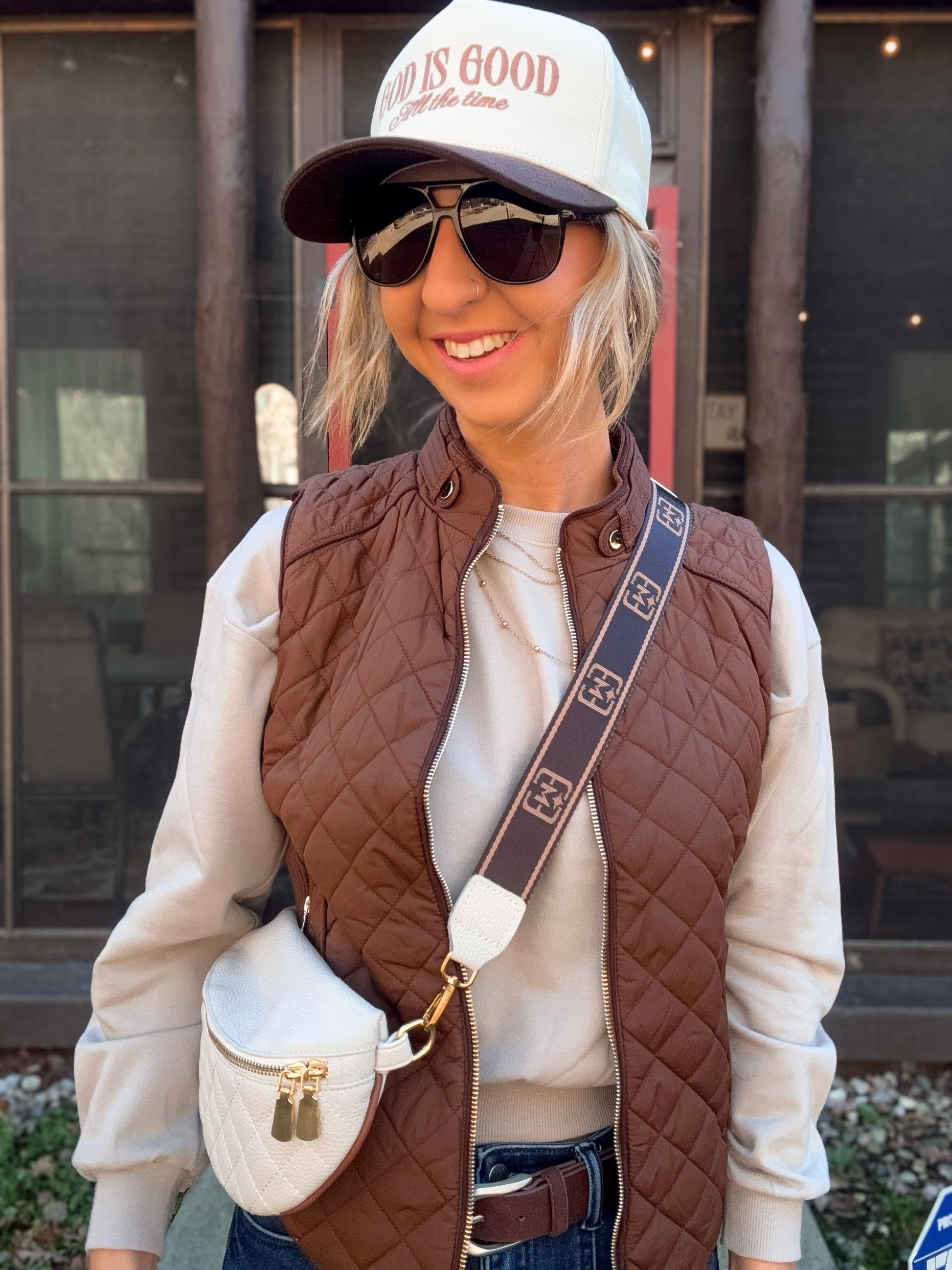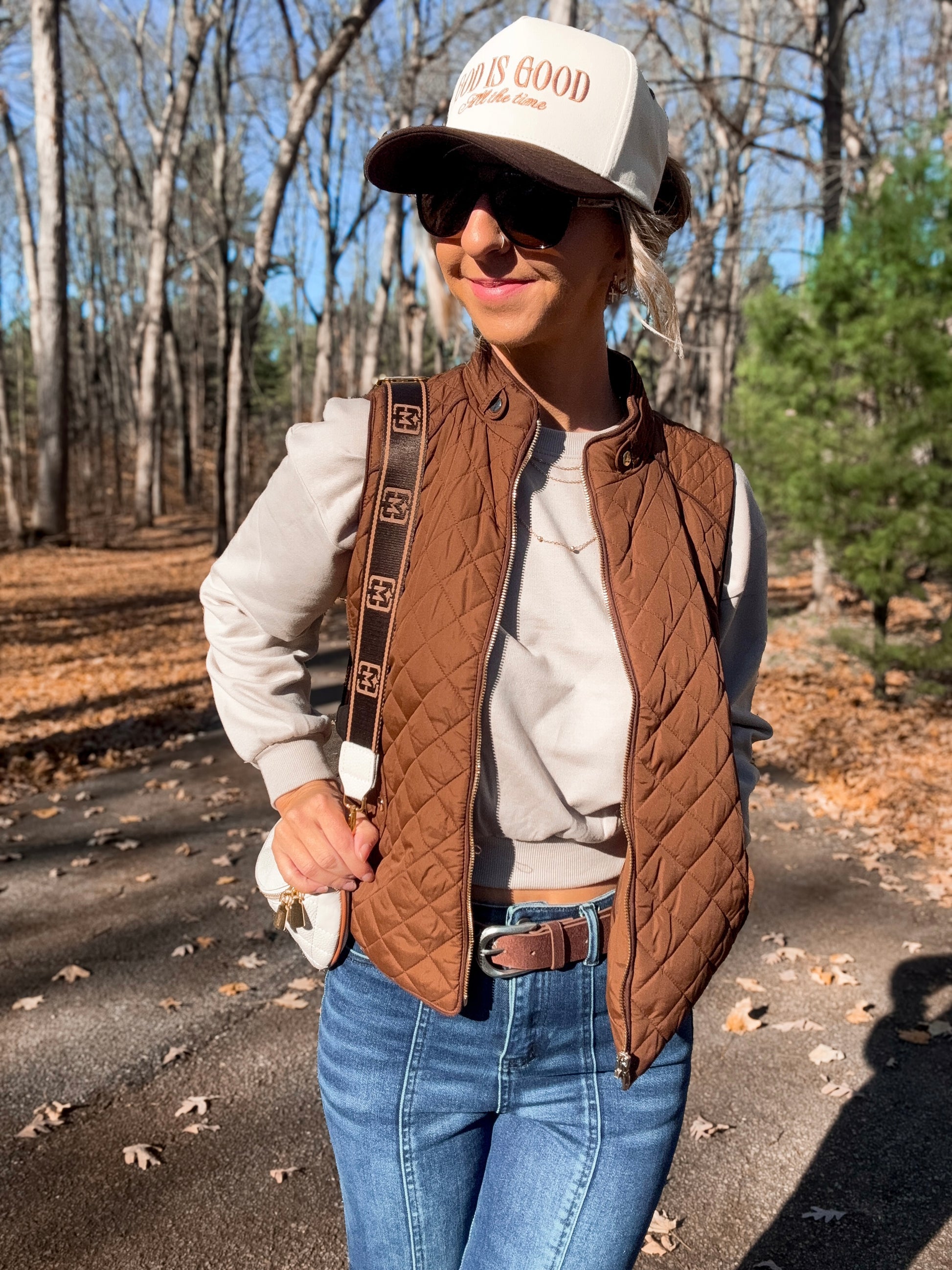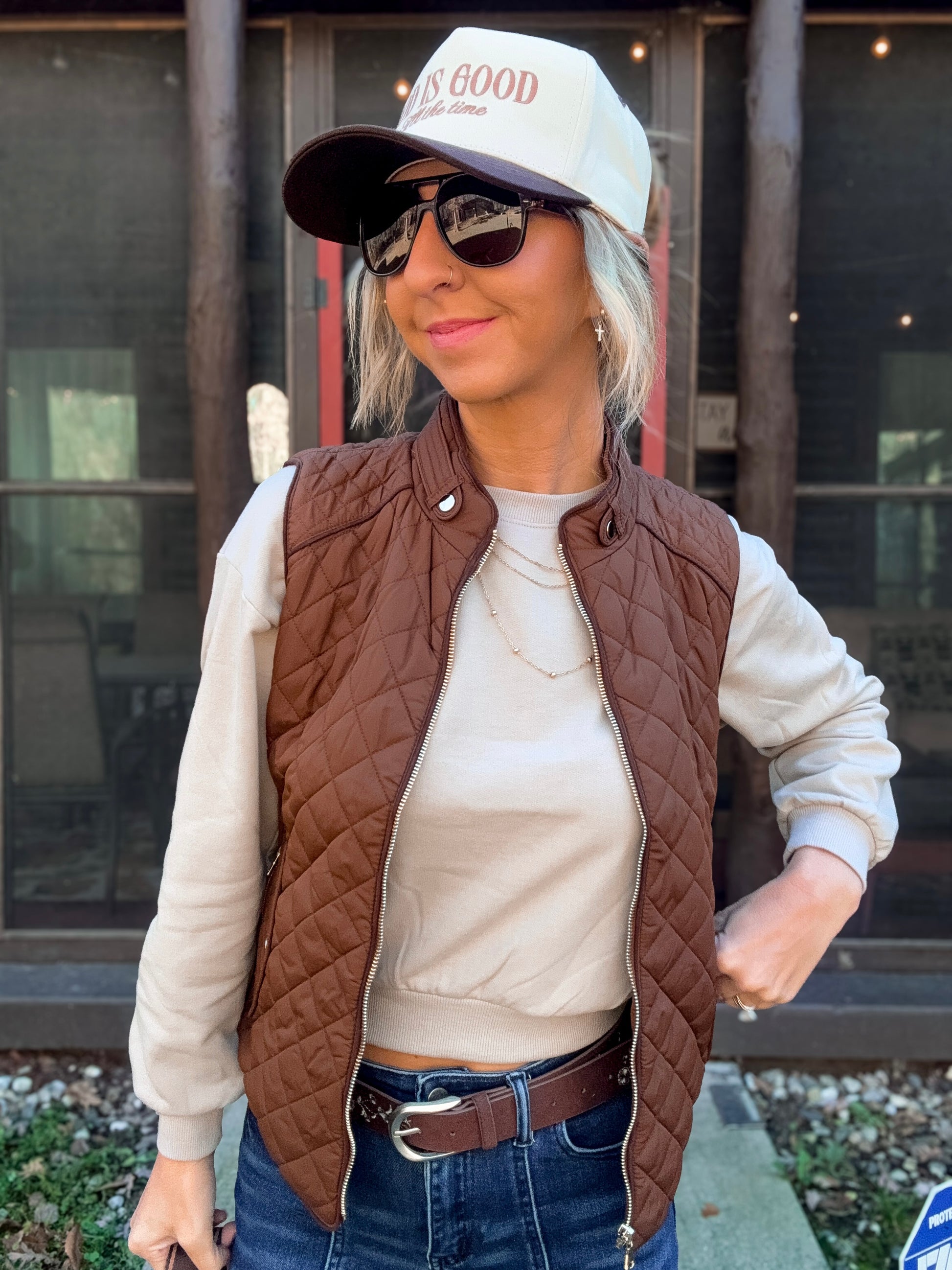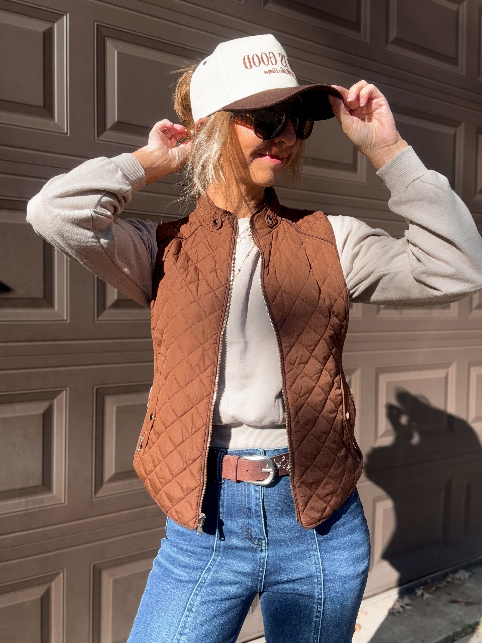Wrap yourself in cozy sophistication with this hazelnut quieted padding vest, finished with gorgeous suede piping details for a warm, elevated touch. Made from 100% polyester quilted padding, it offers lightweight insulation without the bulk—perfect for layering over sweaters, basics, or long sleeves. Side rib panels add flexibility and shape, while the front pockets bring both function and style. Soft, warm, and endlessly wearable, this vest brings that rich hazelnut tone and luxe suede accents together for the perfect fall-to-winter essential.