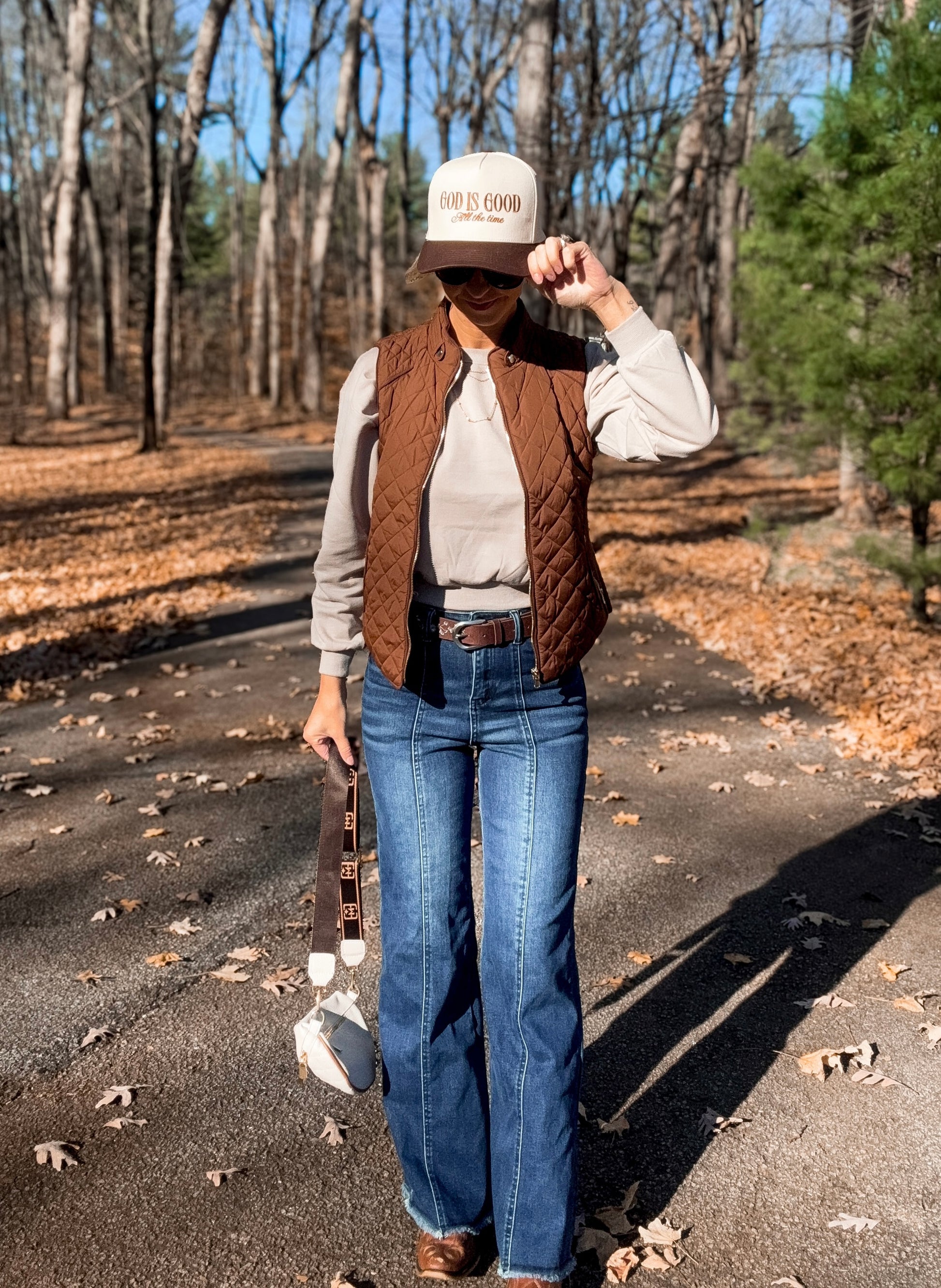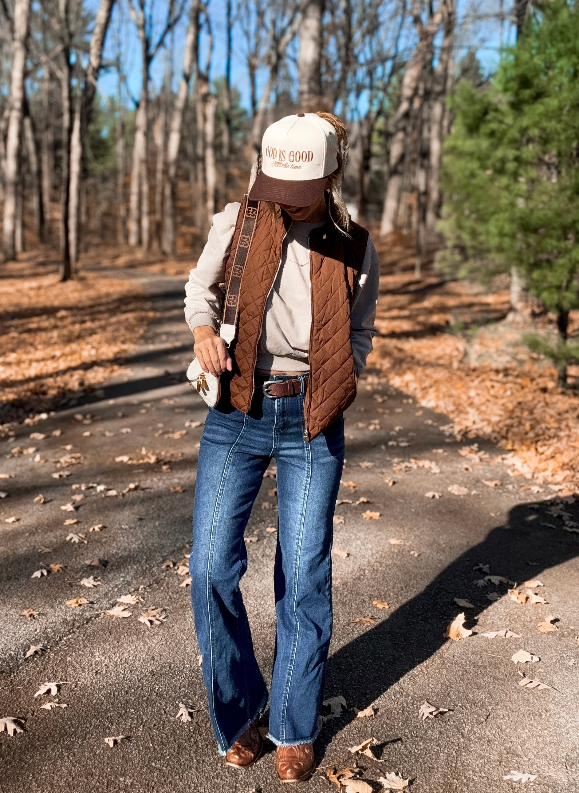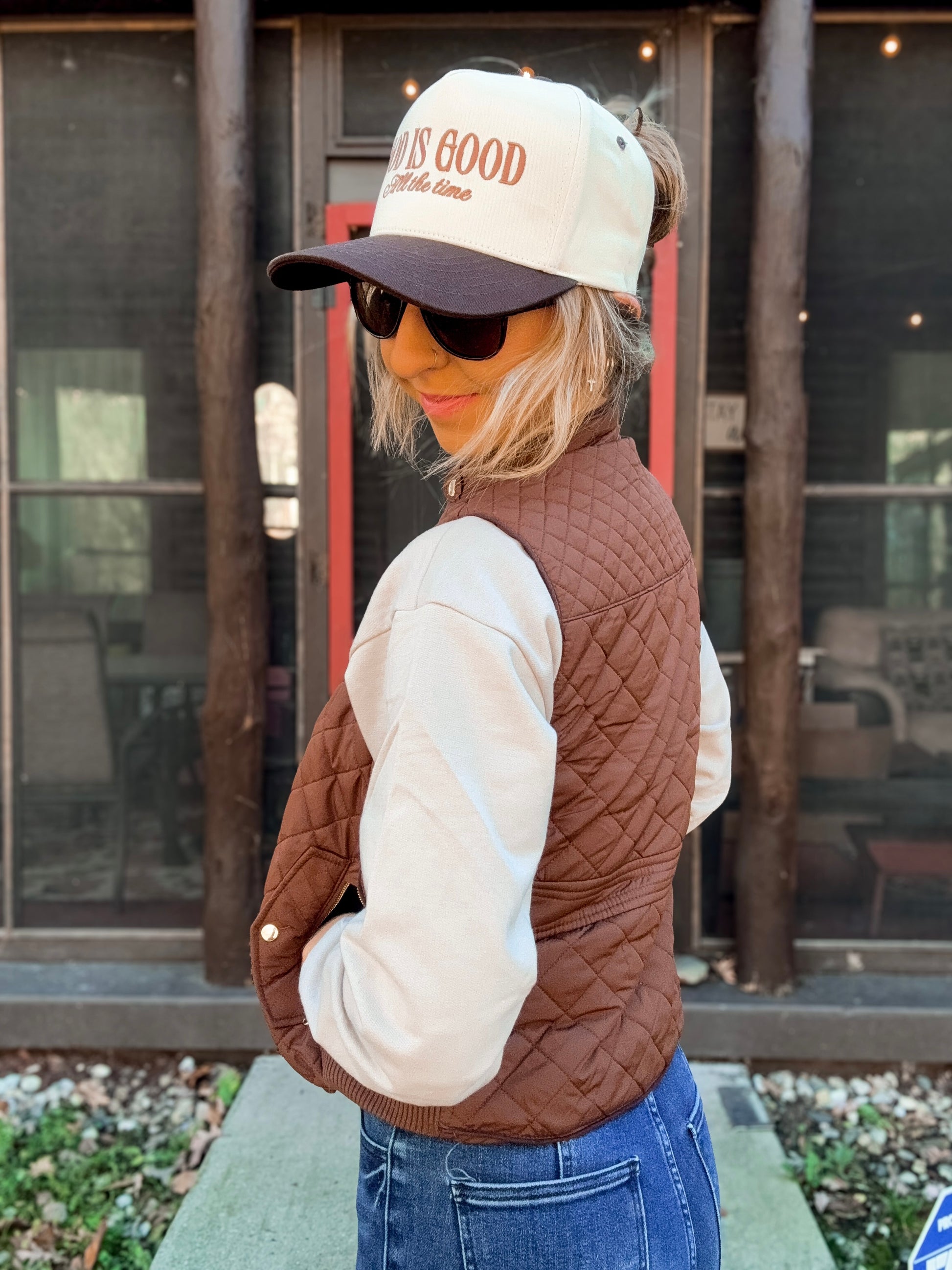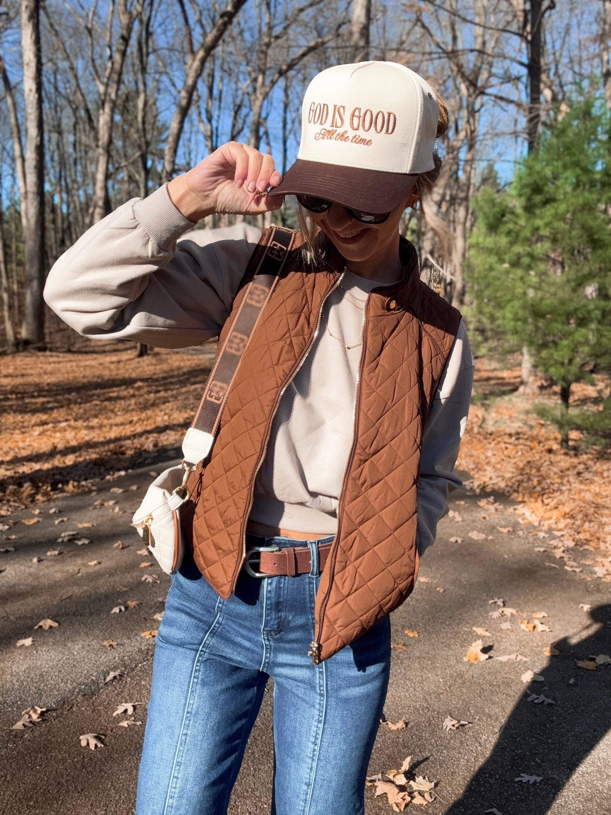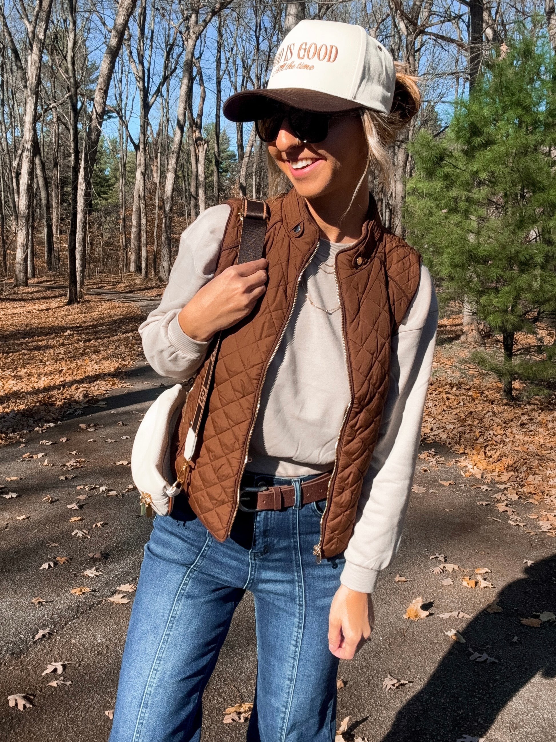 Wrap yourself in cozy sophistication with this hazelnut quieted padding vest, finished with gorgeous suede piping details for a warm, elevated touch. Made from 100% polyester quilted padding, it offers lightweight insulation without the bulk—perfect for layering over sweaters, basics, or long sleeves. Side rib panels add flexibility and shape, while the front pockets bring both function and style. Soft, warm, and endlessly wearable, this vest brings that rich hazelnut tone and luxe suede accents together for the perfect fall-to-winter essential.