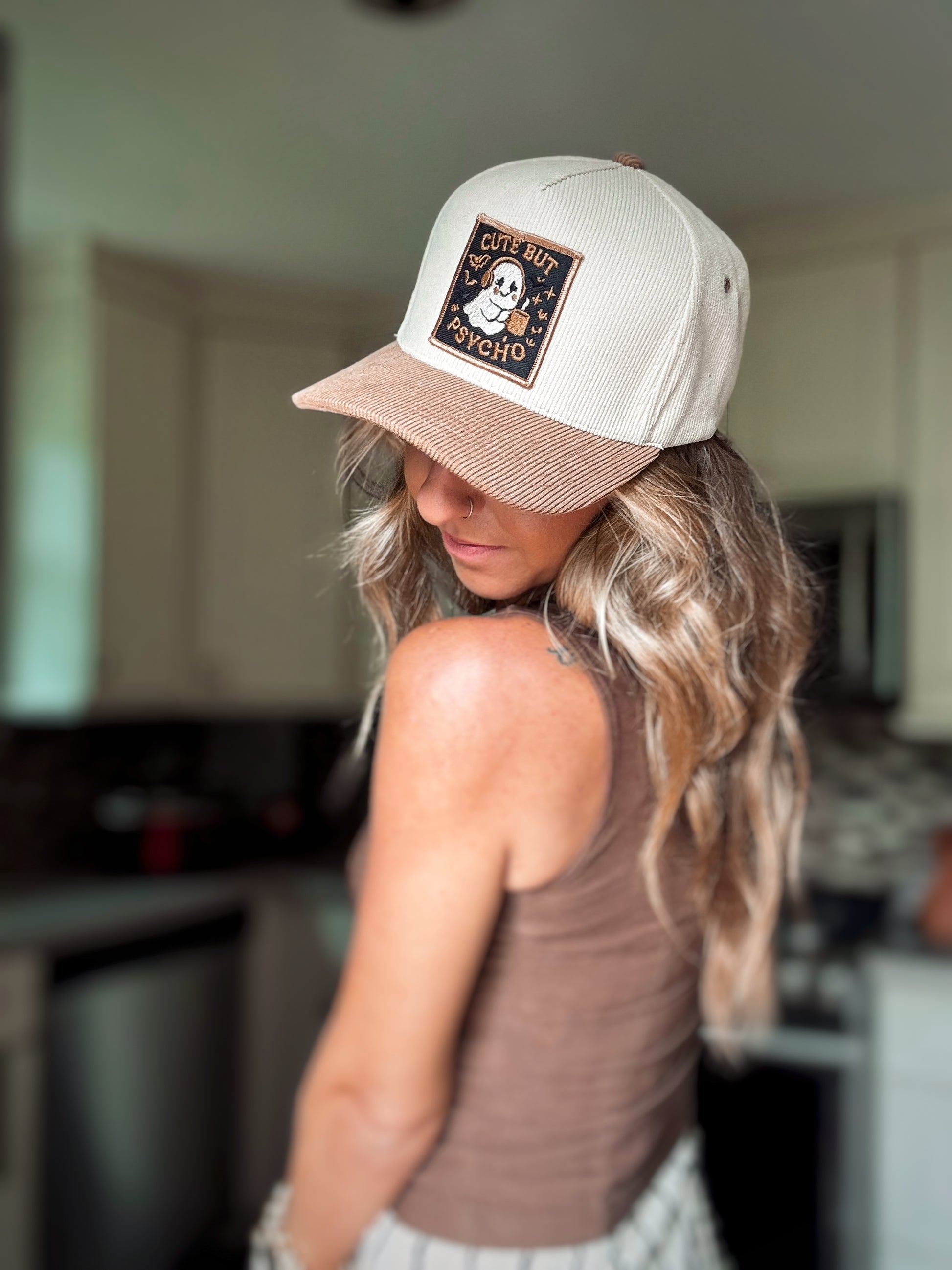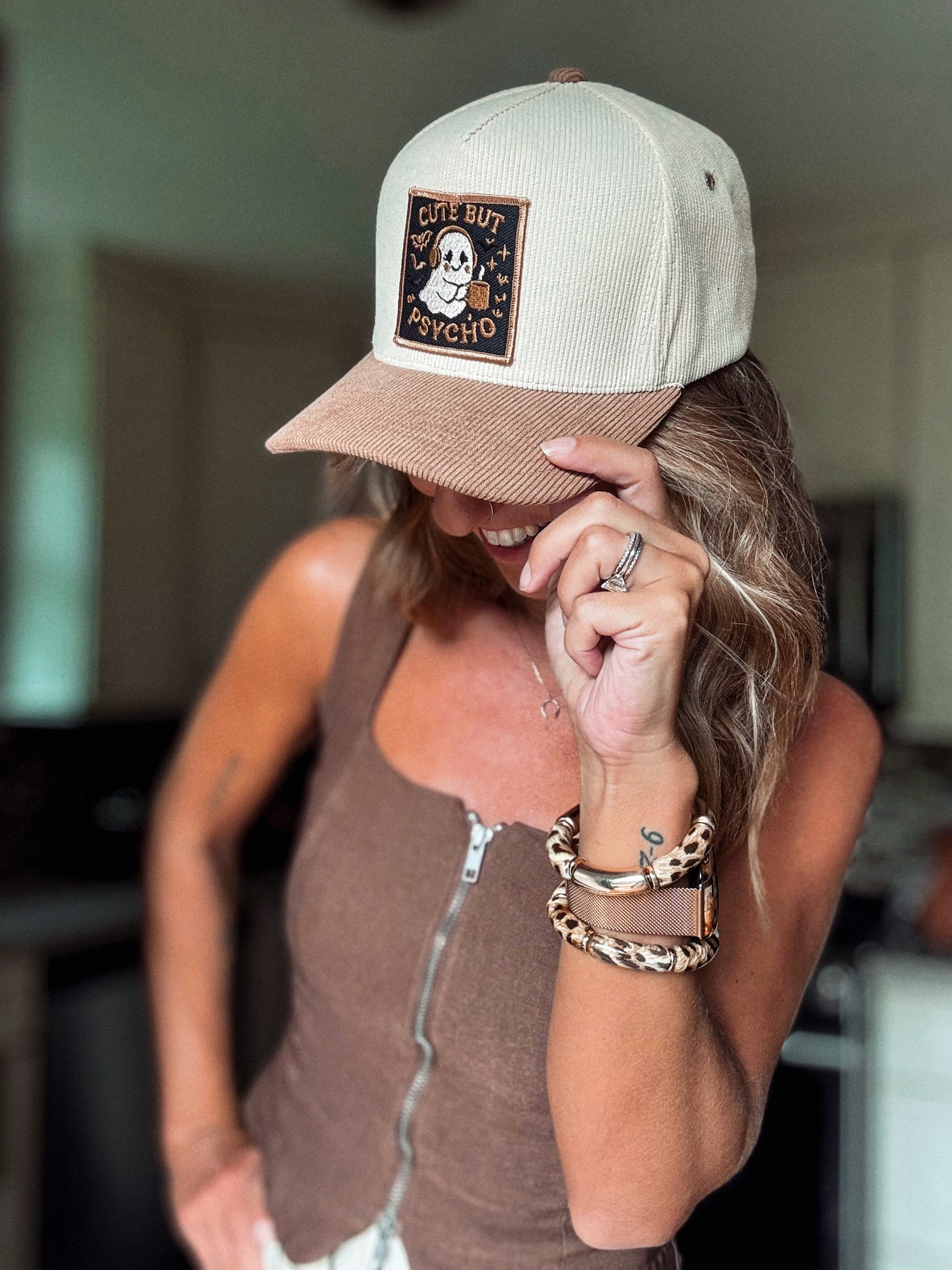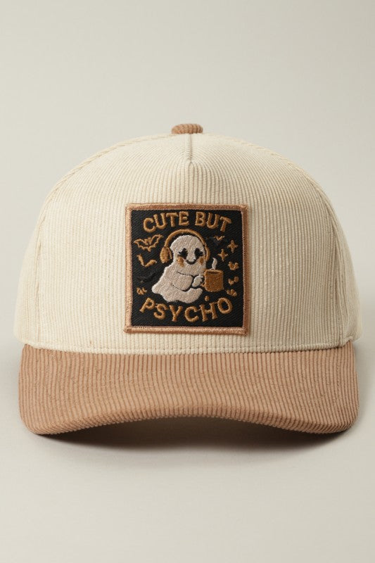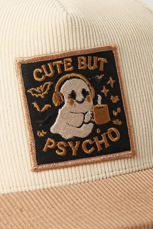 Bring spooky vibes to your streetwear with the Cute But Psycho Ghost Patch Corduroy Trucker Cap. This Halloween-ready accessory blends cozy corduroy with bold embroidered detail, making it the perfect mix of cute and edgy. Whether you’re hitting the pumpkin patch, a fall festival, or just rocking everyday streetwear, this cap is made to turn heads.