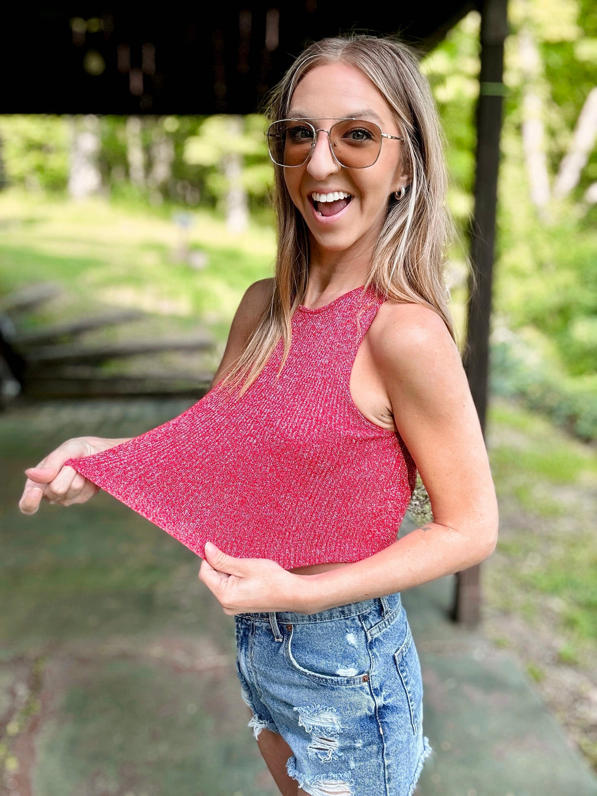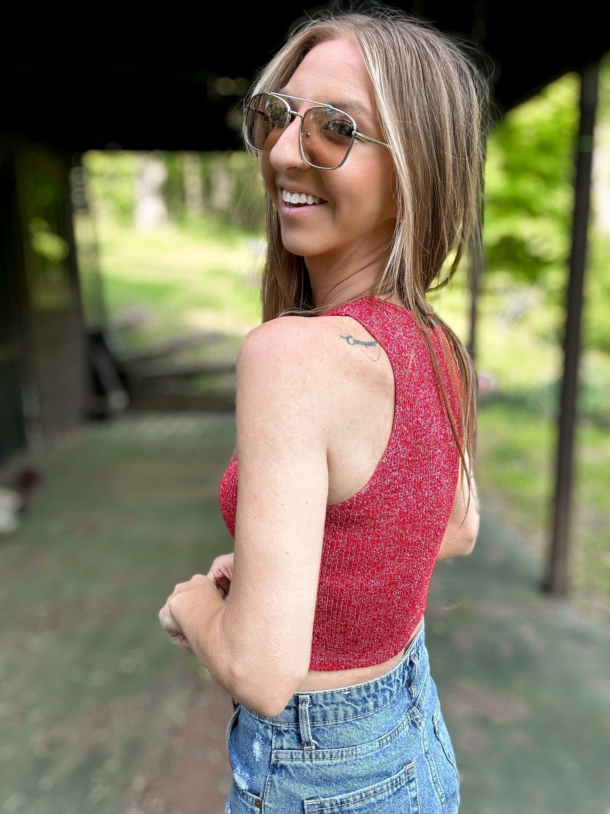 Introducing our Glitter Me Red game day crop top, a captivating timeless crop. Crafted from ribbed knit with a touch of sparkle, it embodies subtle allure. Effortless and endlessly adaptable, it's a wardrobe essential for those fashion-forward occasions. Pair it with jeans, a black skirt, or your go-to shorts and boots for a stunning look this spring and summer!