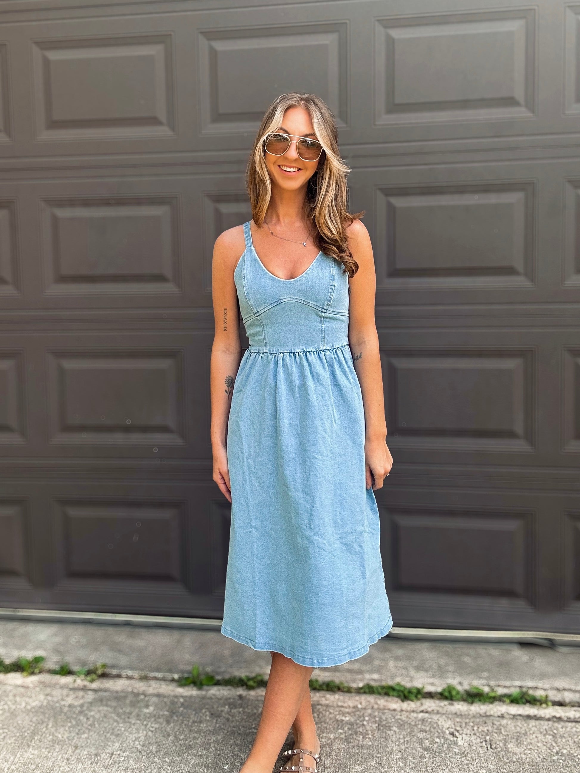 A timeless classic with a flattering twist, this stretchy denim fit & flare dress is your new favorite. Designed with a sweetheart neckline and wide straps, it hugs your curves with a structured bodice and flares out into a soft, A line skirt. The added smocked panel in the back ensures a comfortable, flexible fit while keeping the silhouette sleek and tailored. Made from a soft, stretchy denim fabric, it's the perfect blend of style and ease. Half zipper back, adjustable straps and an amazing fit!