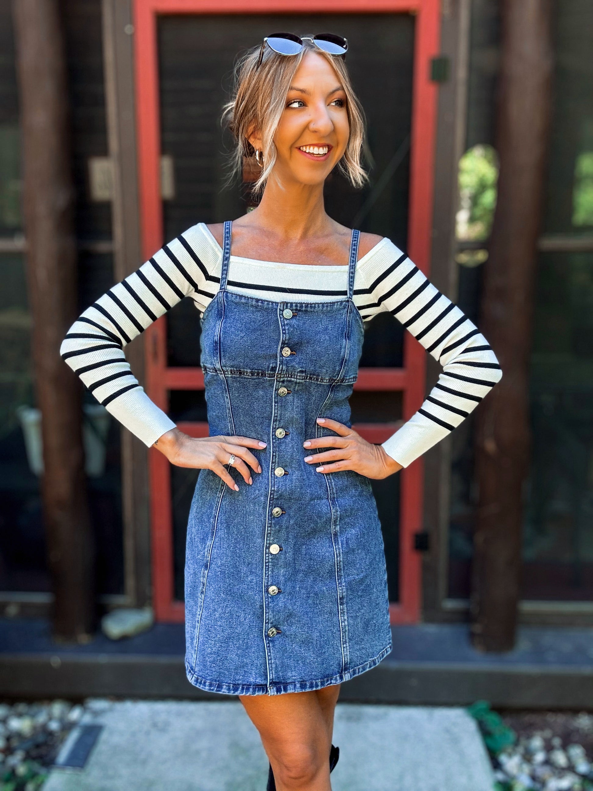Channel effortless 90s charm with The Meadow Wash Denim Mini Dress. Crafted from soft, washed denim for that lived-in vintage look, this flattering mini features a square neckline, thick adjustable straps, and a full button-down front with silver-tone hardware. Vertical princess seams sculpt the waist before flowing into a subtle A-line skirt for an easy, body-hugging fit. Pair it with a fitted tee/sweater or wear it solo for a timeless, laid-back vibe.