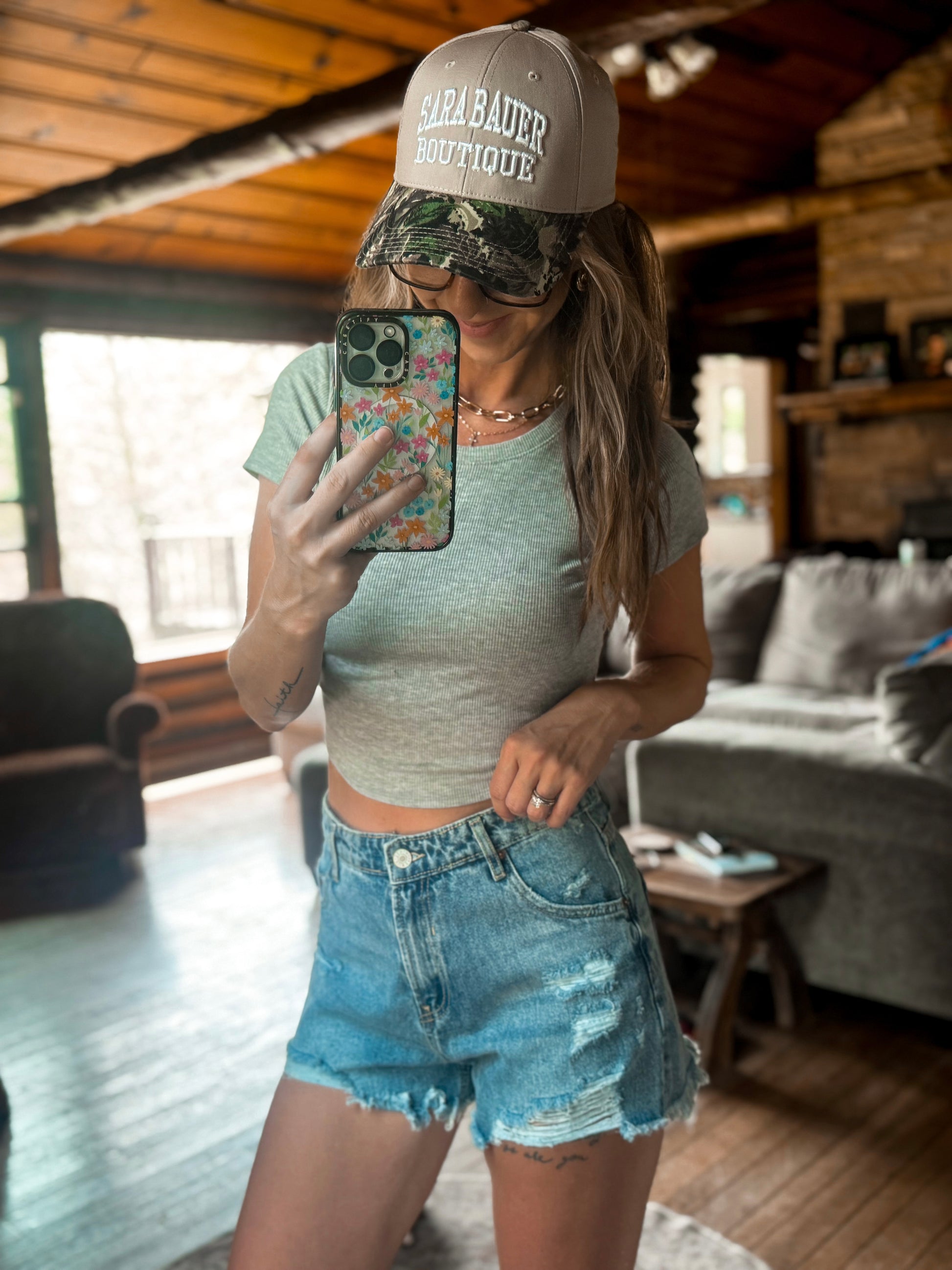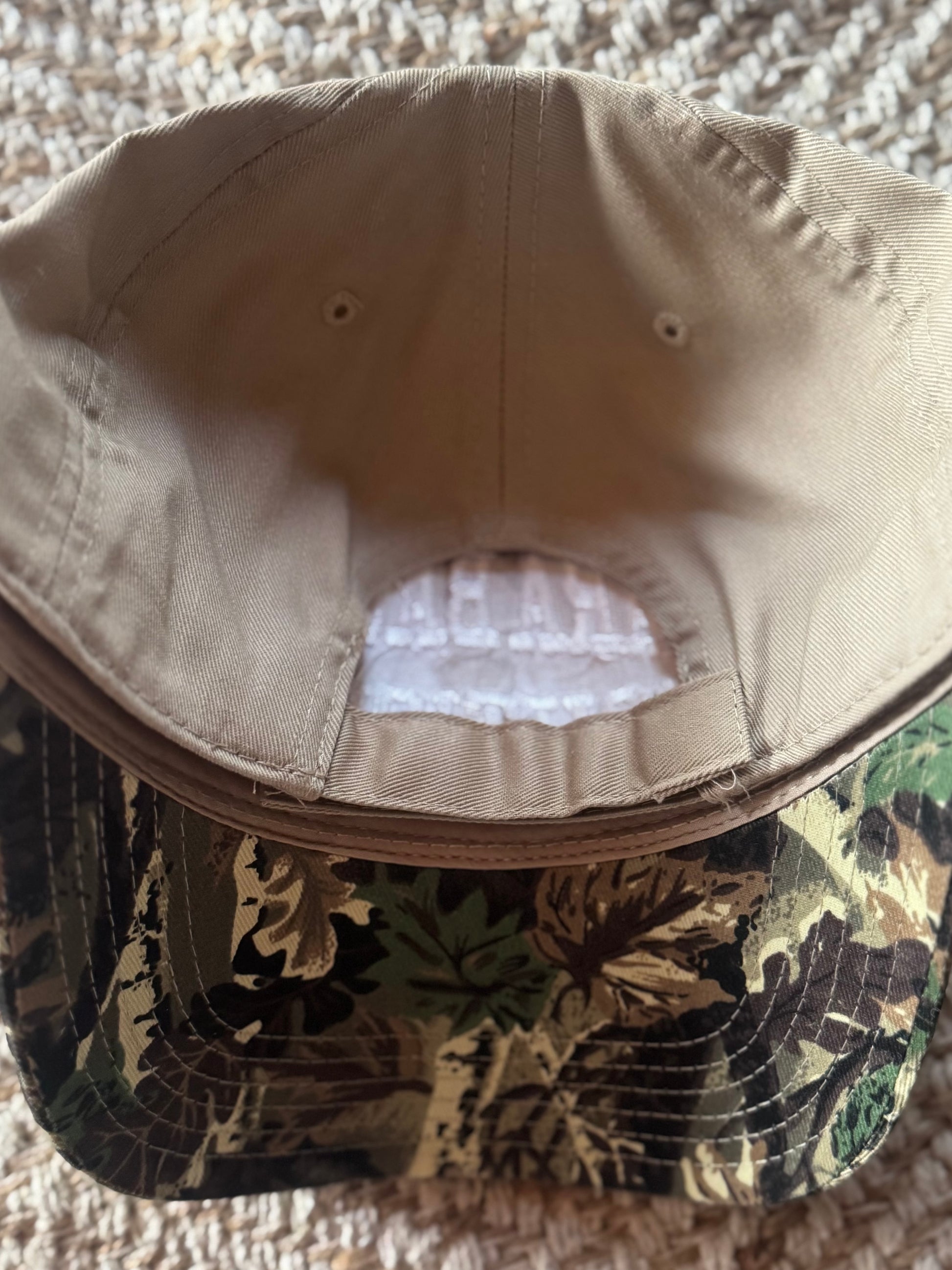 Rep your favorite boutique in style with our new go-to hat. Featuring a khaki top and camo bill, this classic fit delivers max comfort with a sporty edge. The premium fabric and embroidered Sara Bauer Boutique lettering give it that clean, stylish look that goes with everything. Velcro adjustable back for the perfect fit—whether you're headed to a car show, hitting the trails, or just keeping it casual. It’s not just a hat—it’s a vibe.