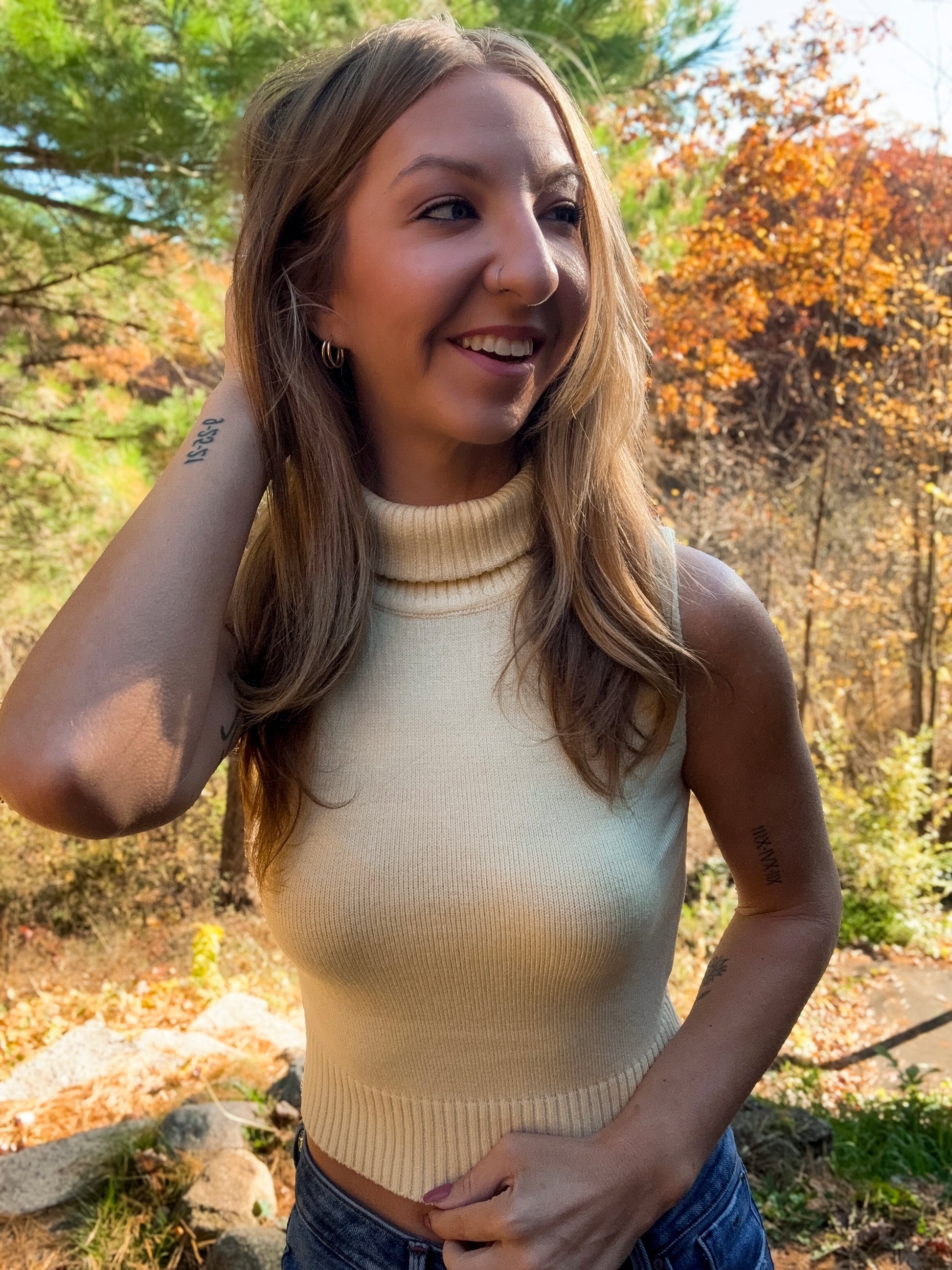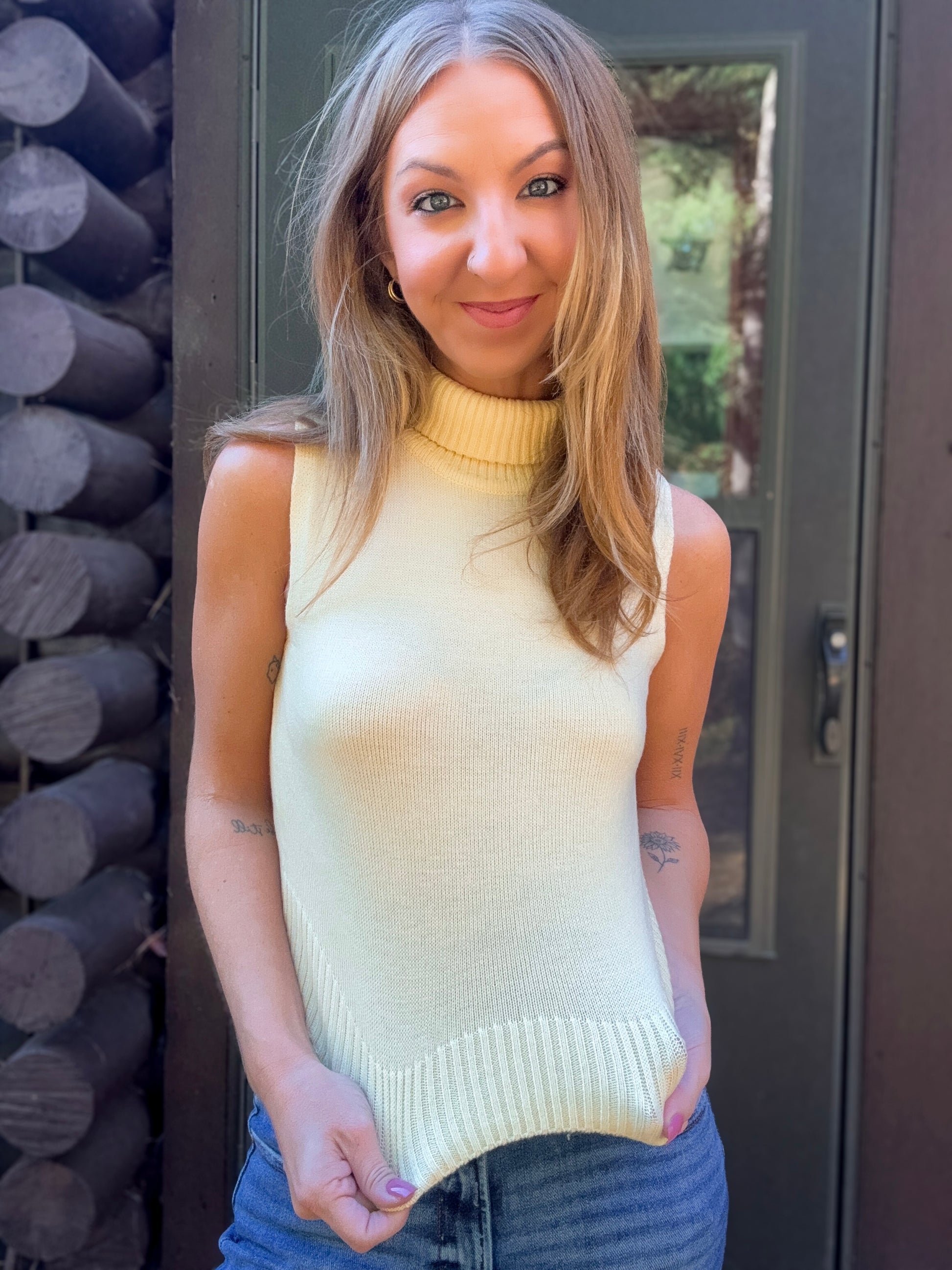 A modern staple for layering or wearing on its own, the Sleeveless Turtleneck Knit Top features a mock turtleneck and a fitted sleeveless silhouette.