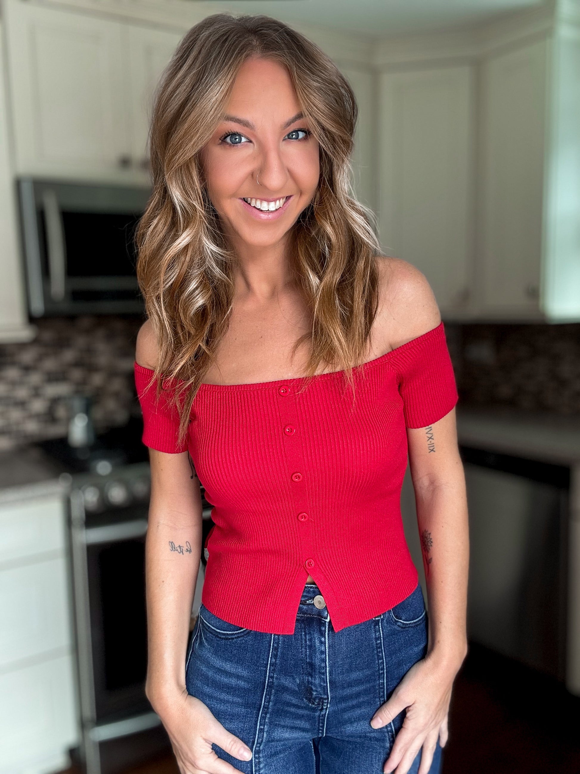 An easy short-sleeve sweater top with an off-the-shoulder neckline and button-down placket front. Comfortable, flattering, and easy to style year-round. Looks just as good half-tucked as it does worn loose.