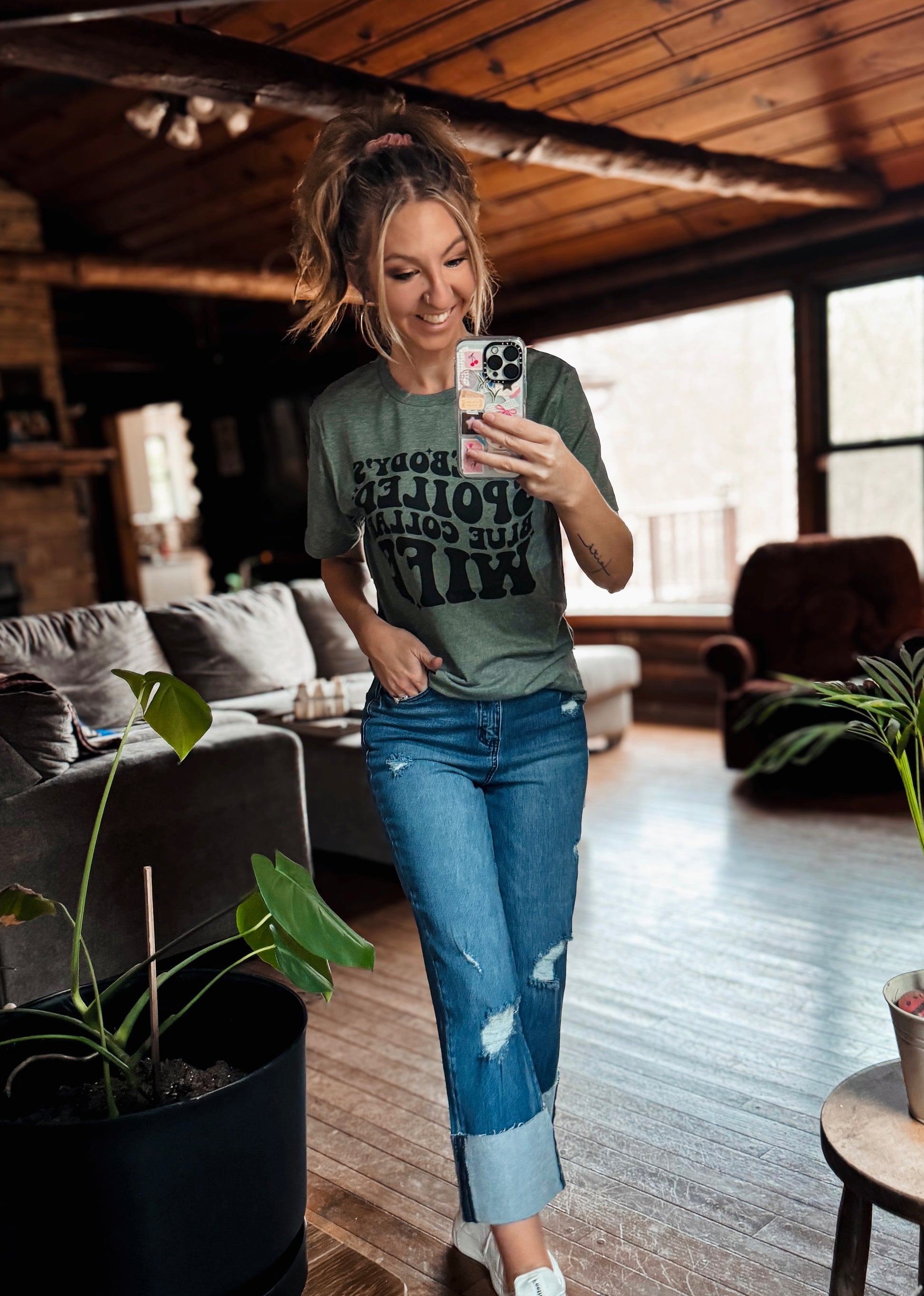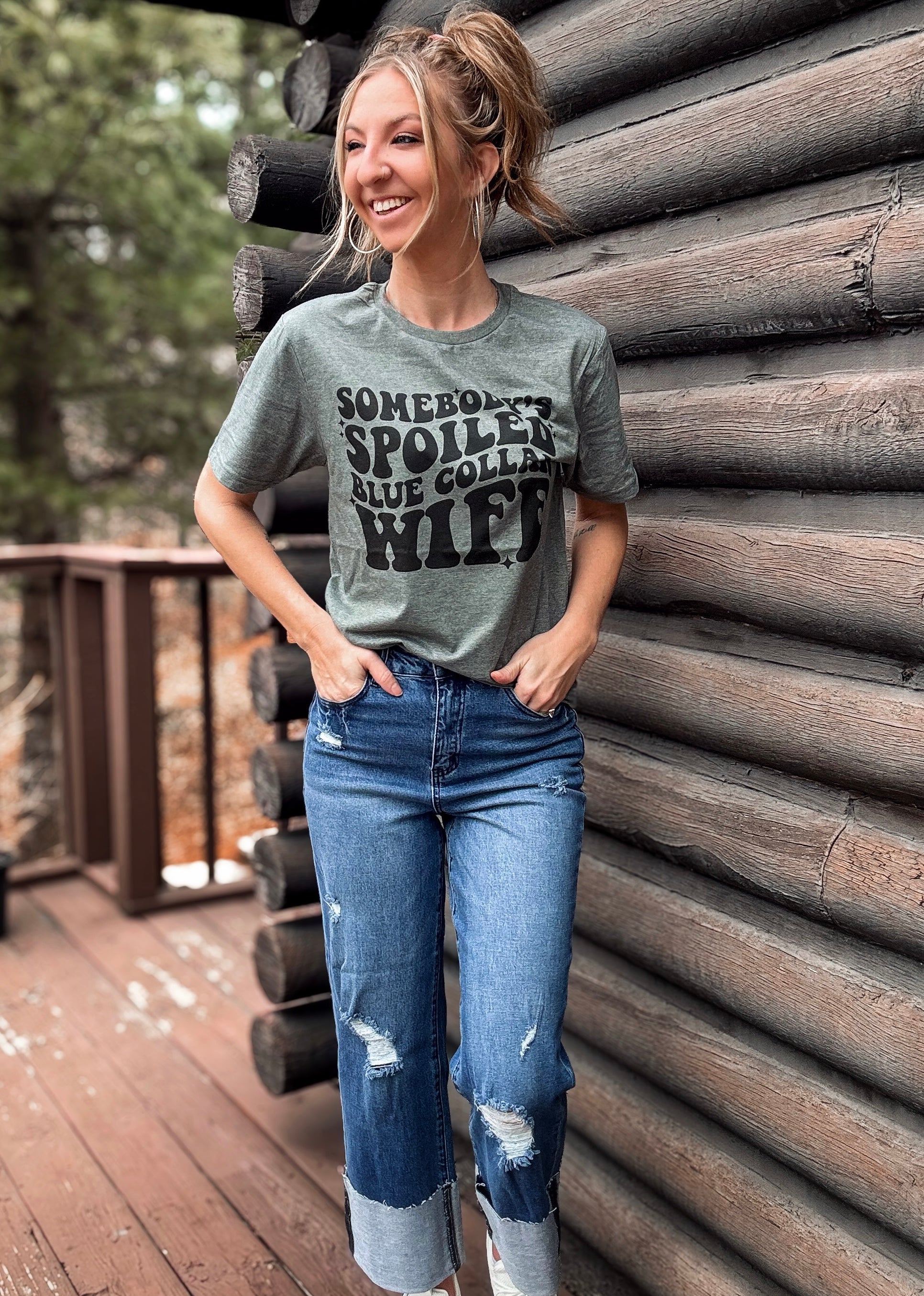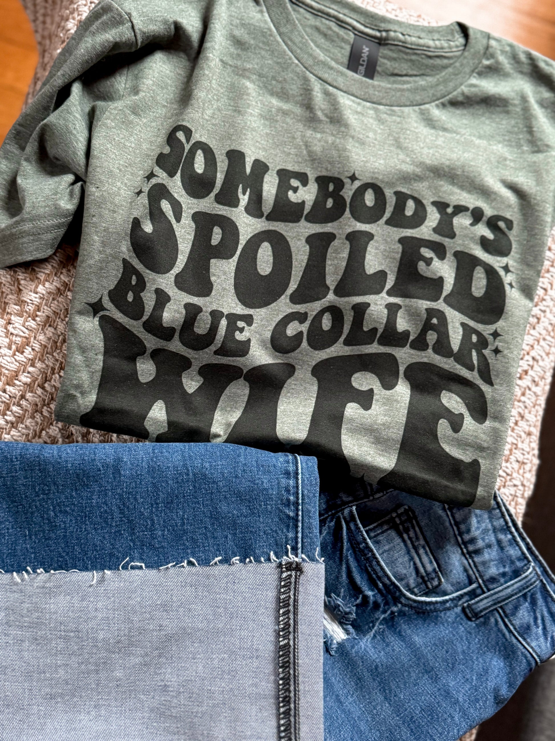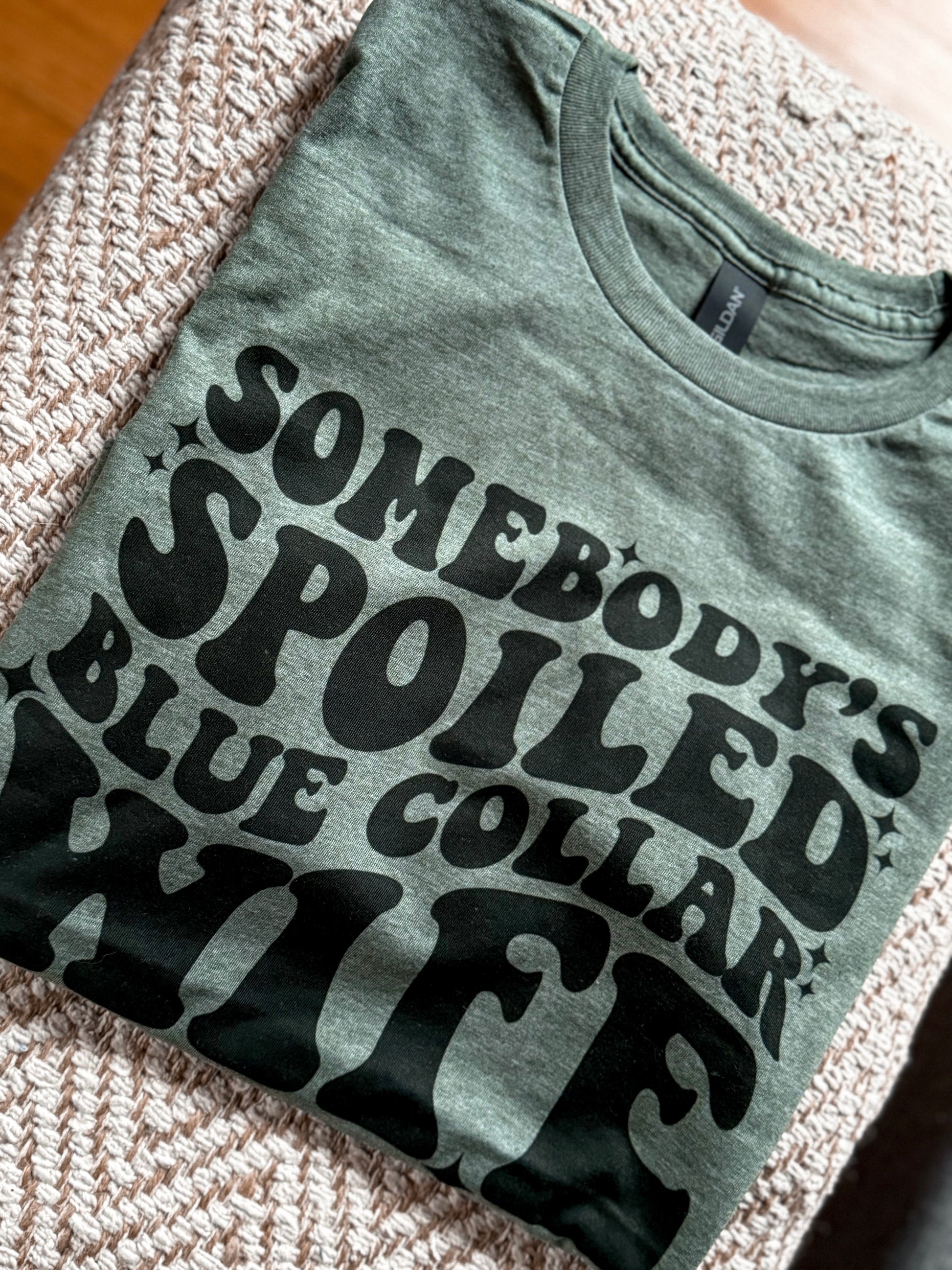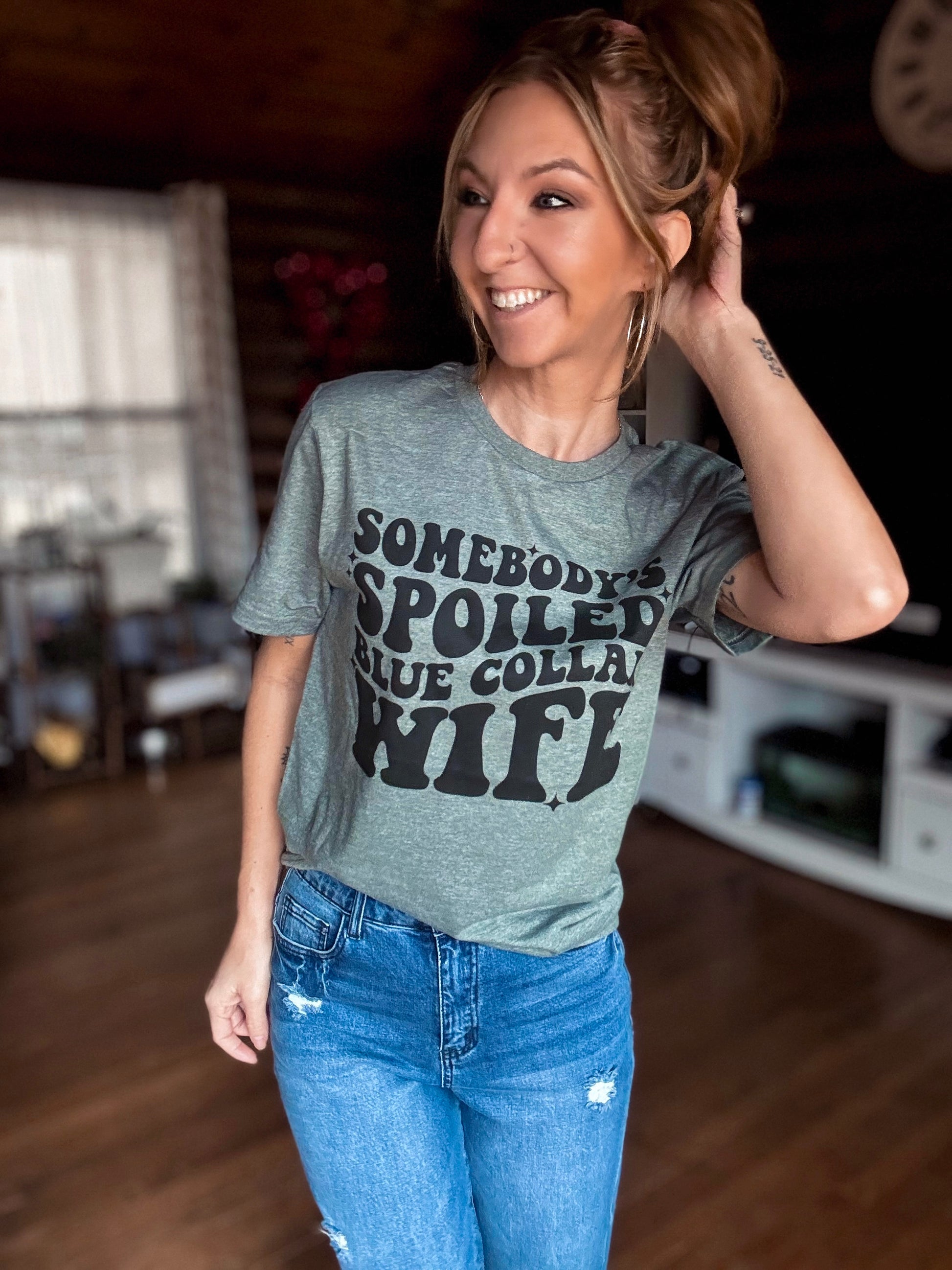 You work hard, love harder, and know your worth—and this tee says it all! Our "Somebody’s Spoiled, Blue-Collar Wife" graphic t-shirt is made for the women who support their hardworking partners while still getting what they deserve. Printed on a Gildan Softstyle Unisex Fit, this tee offers a soft, lightweight feel with just the right amount of stretch.