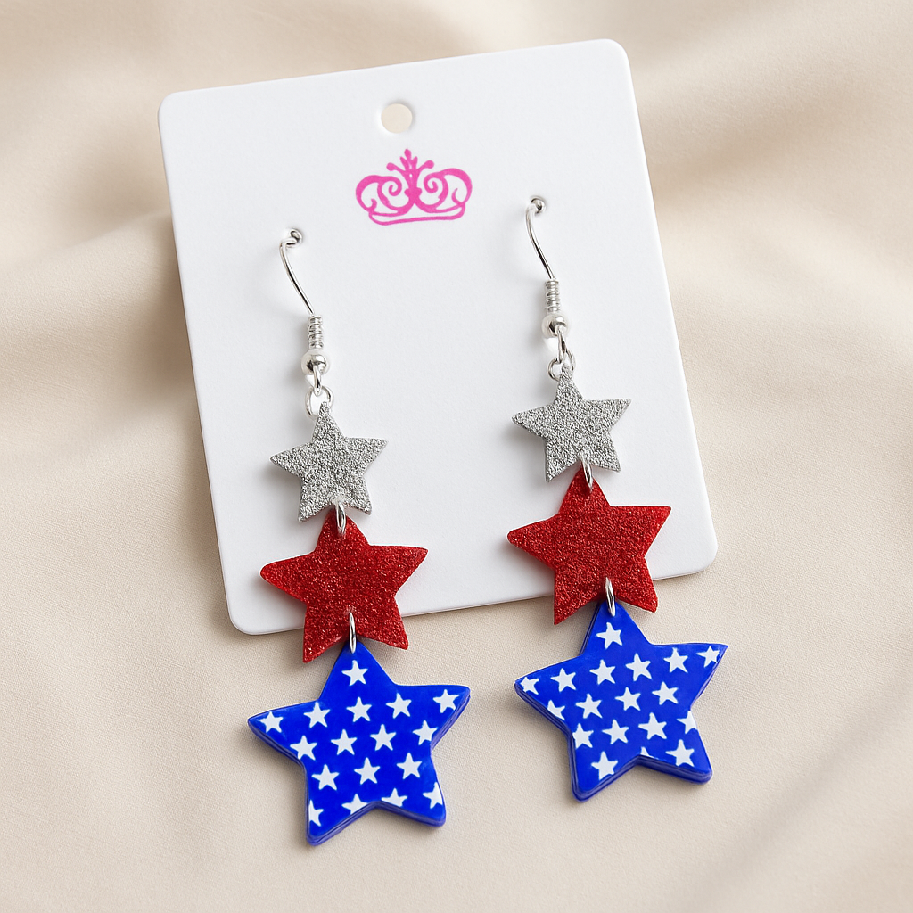 Light up your look with these Star-Spangled Sparkle Earrings! Featuring a stunning trio of stars—silver glitter, bold red shimmer, and blue with crisp white stars—these earrings are perfect for Fourth of July festivities, parades, or anytime you want to show your American pride. Lightweight and eye-catching, they add the perfect pop of patriotic flair to any outfit. Pair them with denim, sundresses, or your favorite graphic tee for an effortlessly festive look.