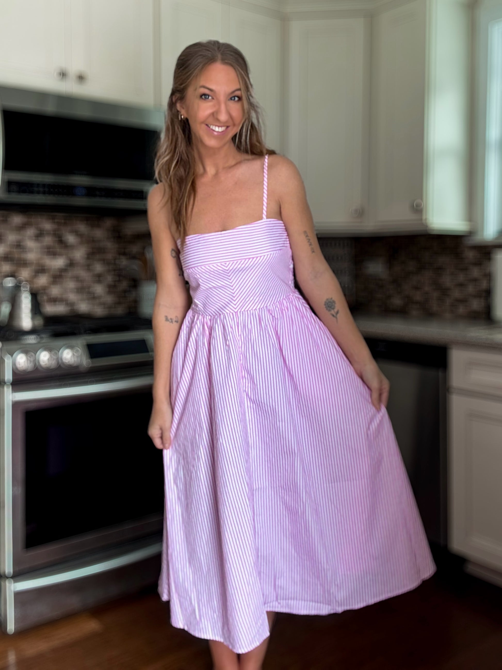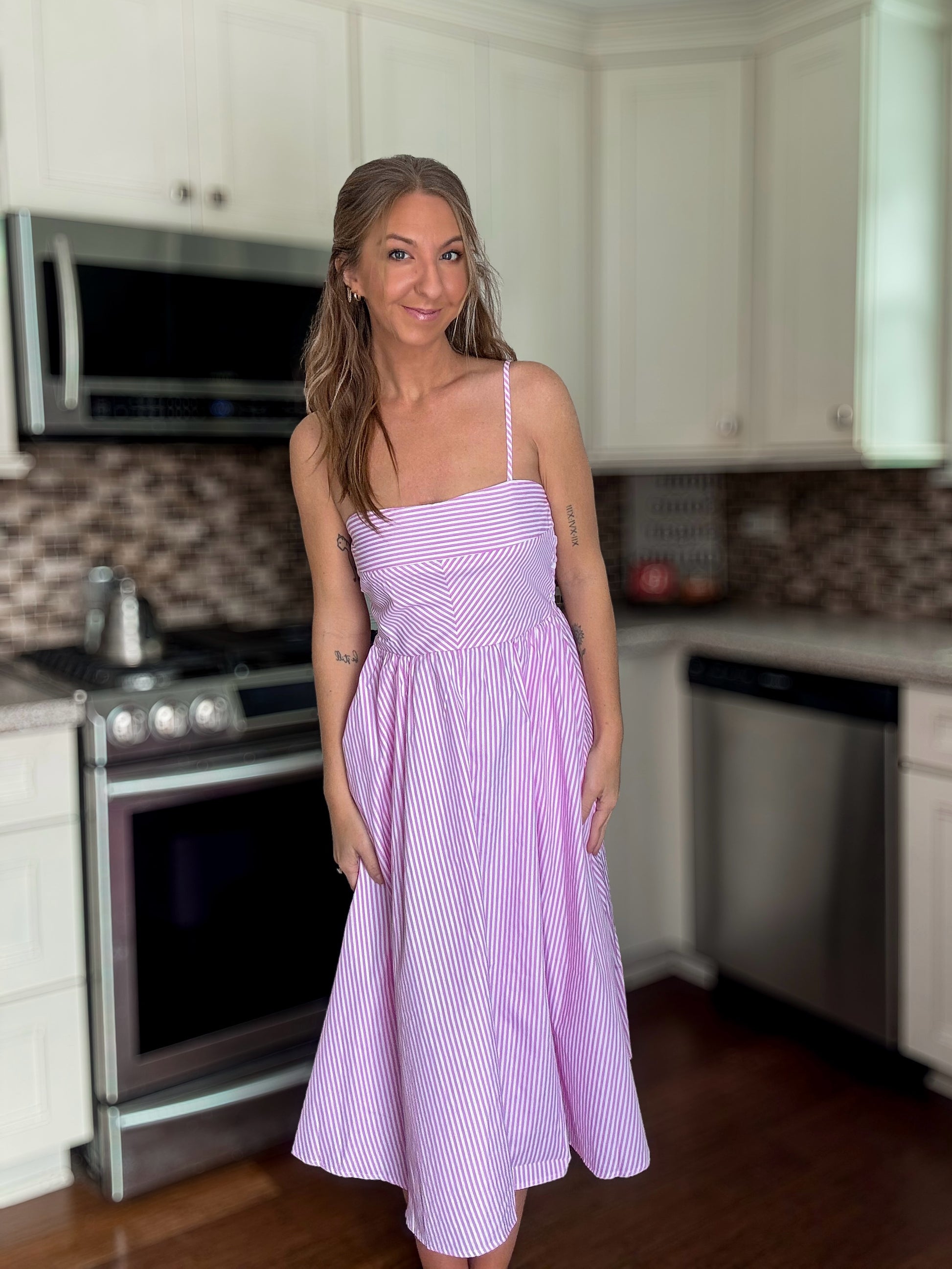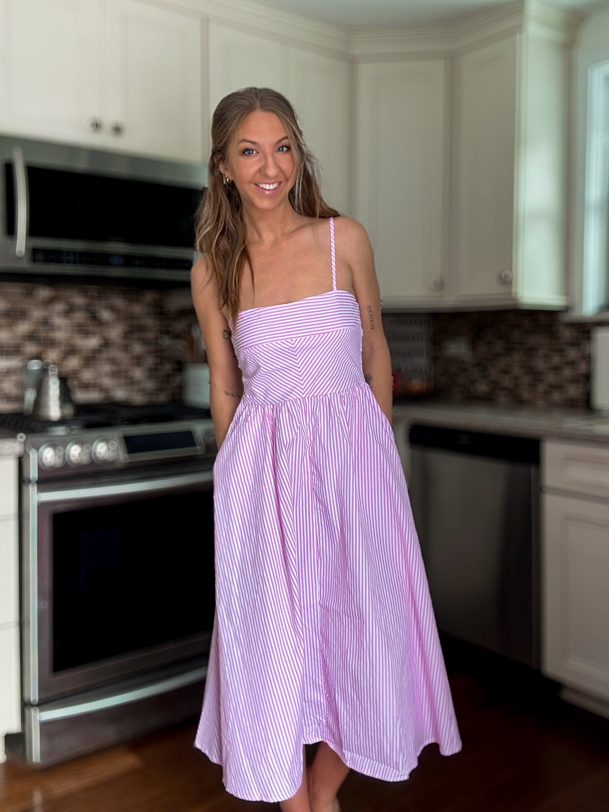 This pink and white striped dress is the definition of easy summer charm. Designed with delicate adjustable spaghetti straps, a flattering fitted bodice, and a flared skirt that moves beautifully with you. The side pockets make it as practical as it is cute. Just add a sun hat and sandals for a breezy, put-together warm-weather look.