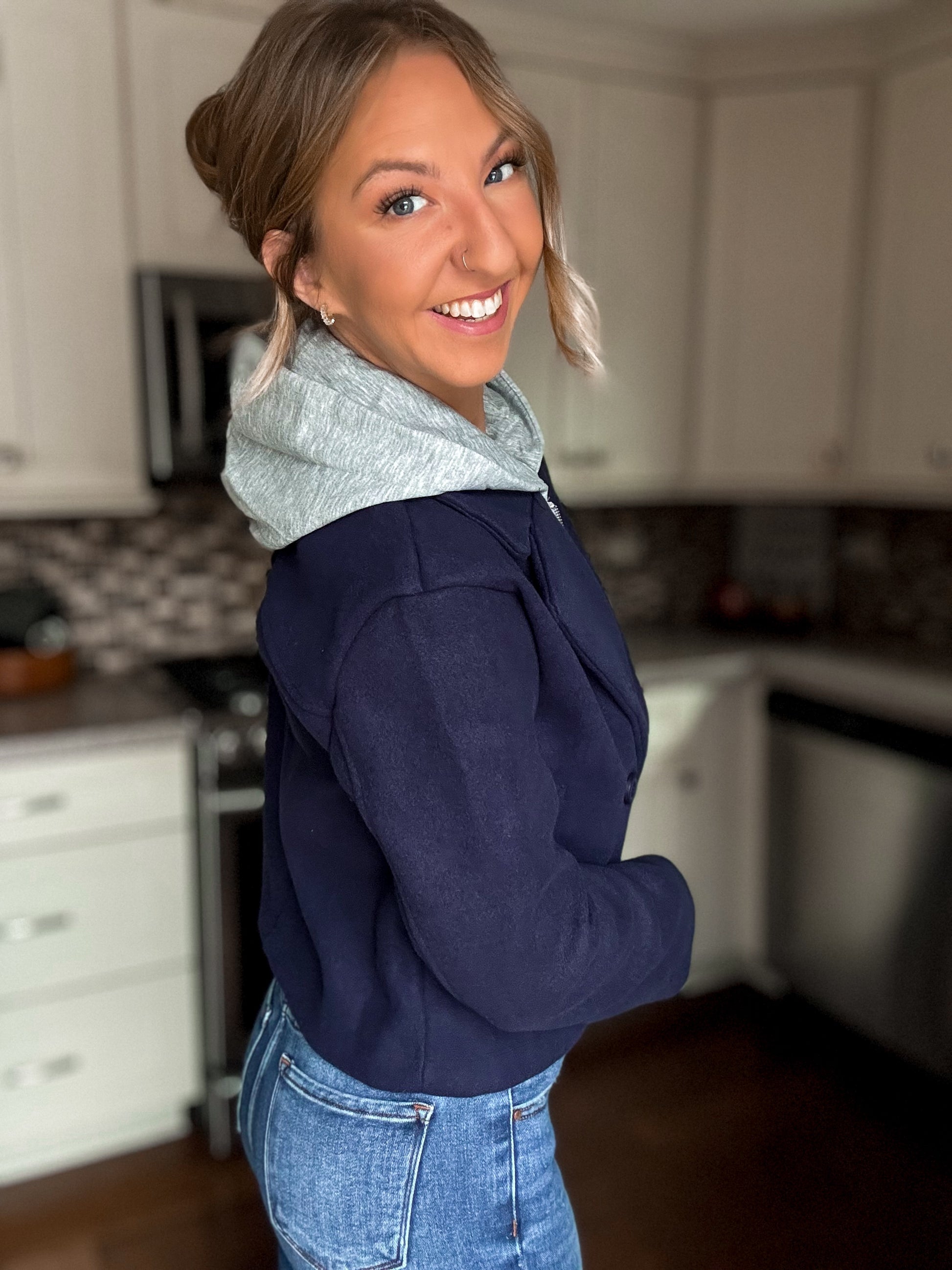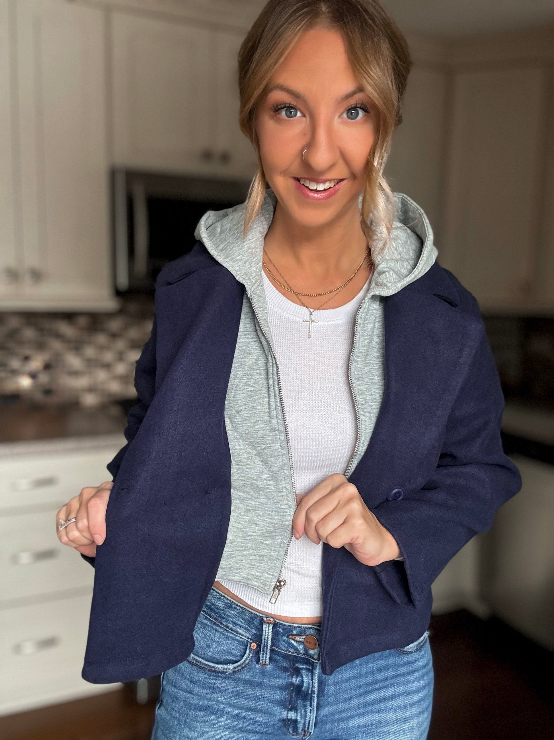 Layer in style with the Midnight Fog Blazer. This woven jacket pairs a navy and grey textured fabric with a cozy hoodie insert, giving you a polished yet relaxed look. Features include long sleeves, a notch collar, front button closures, and welt pockets for subtle detail. The perfect mix of tailored sophistication and casual comfort—ideal for layering over tees, blouses, or lightweight sweaters.
