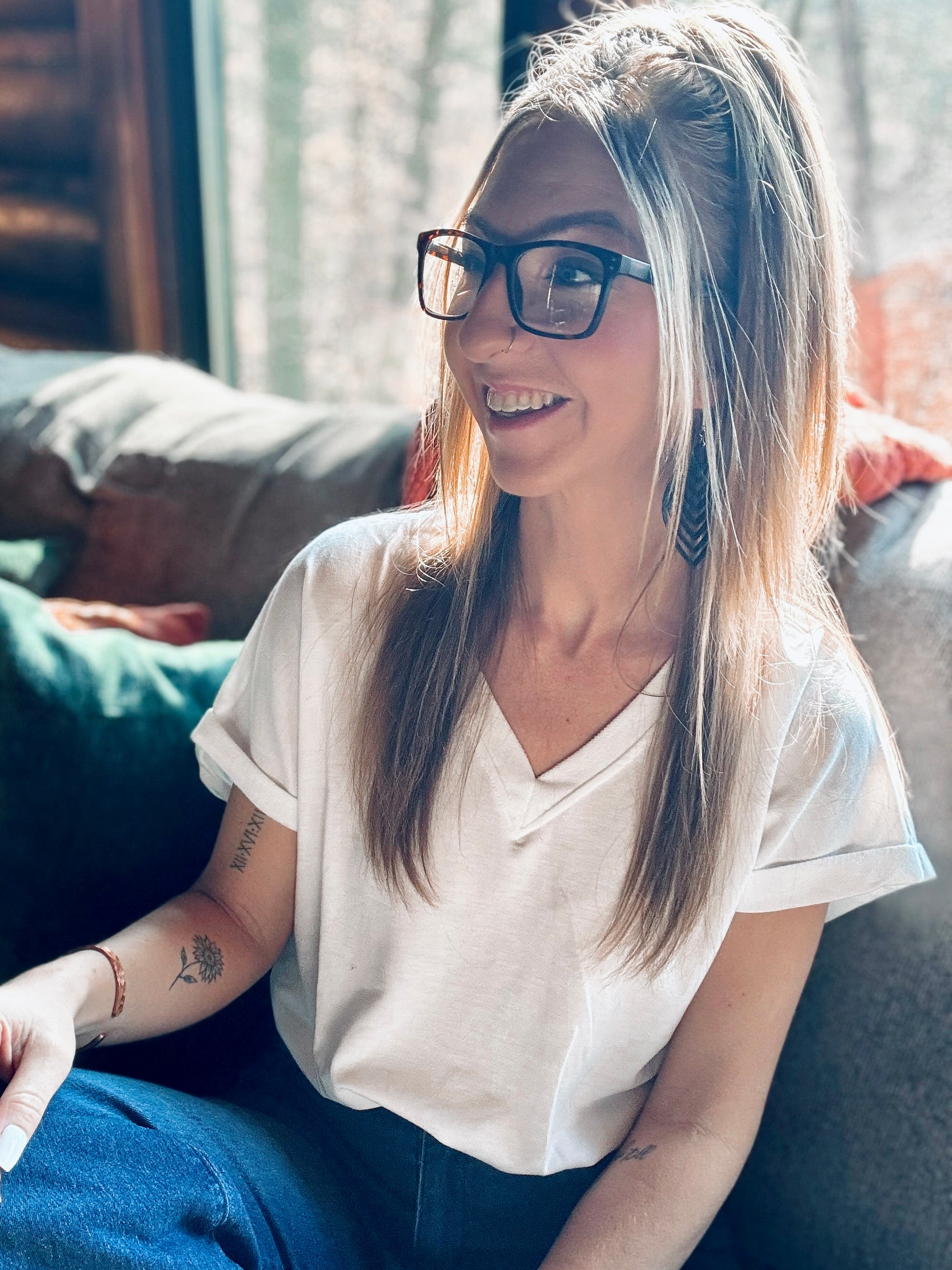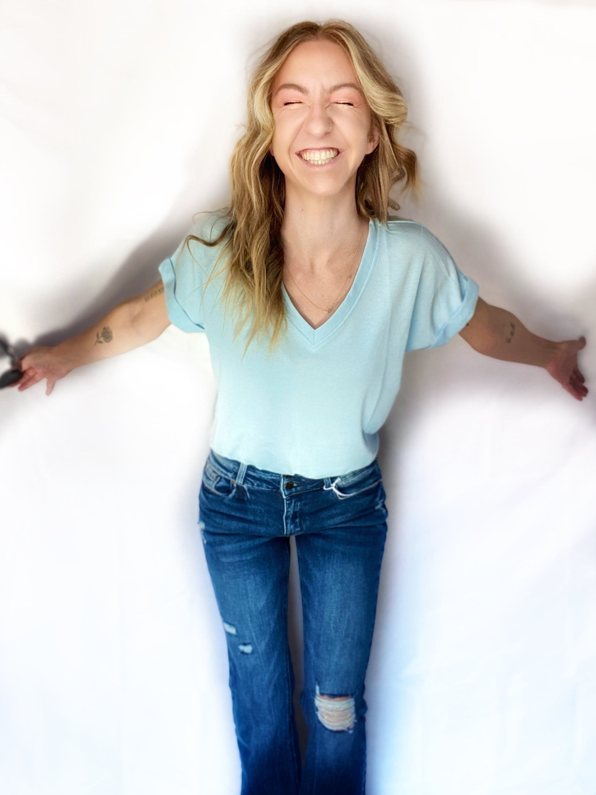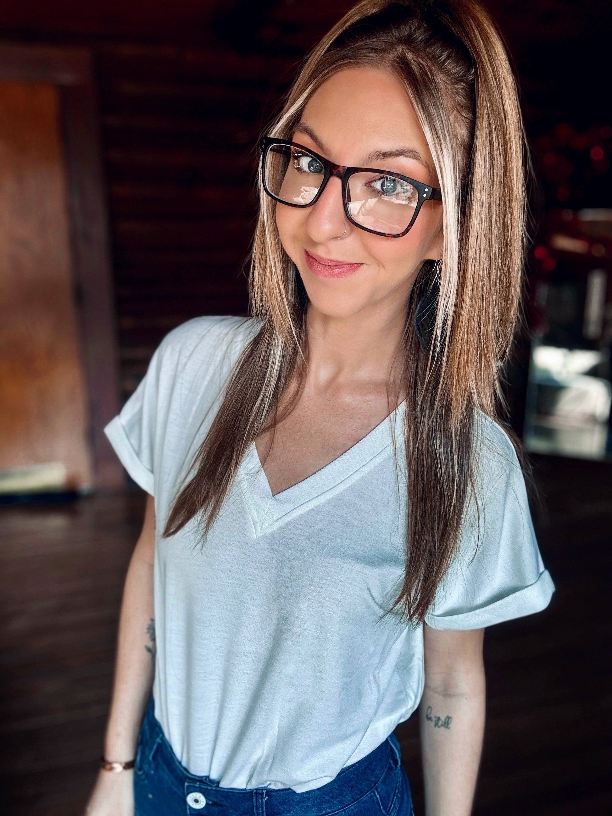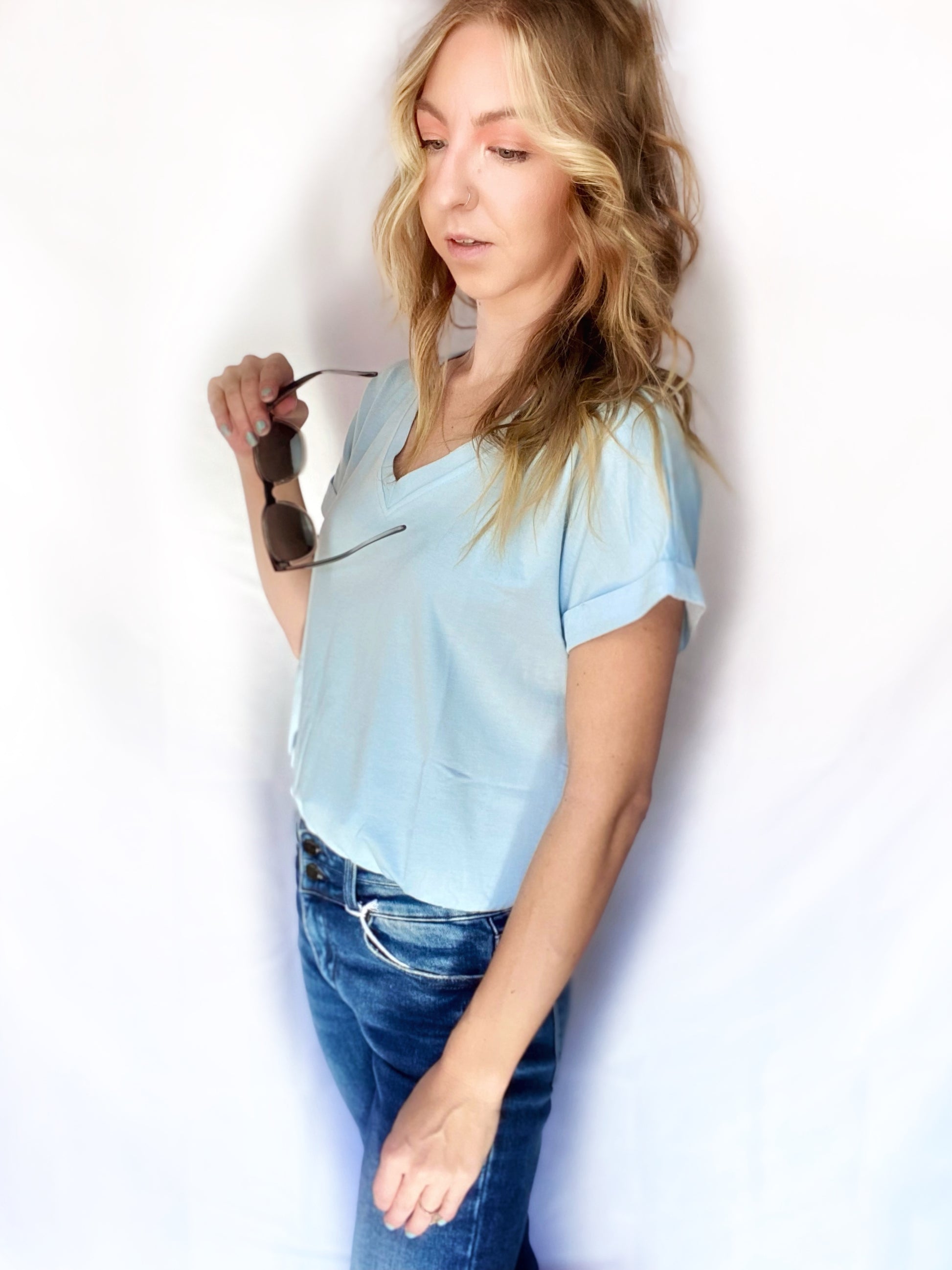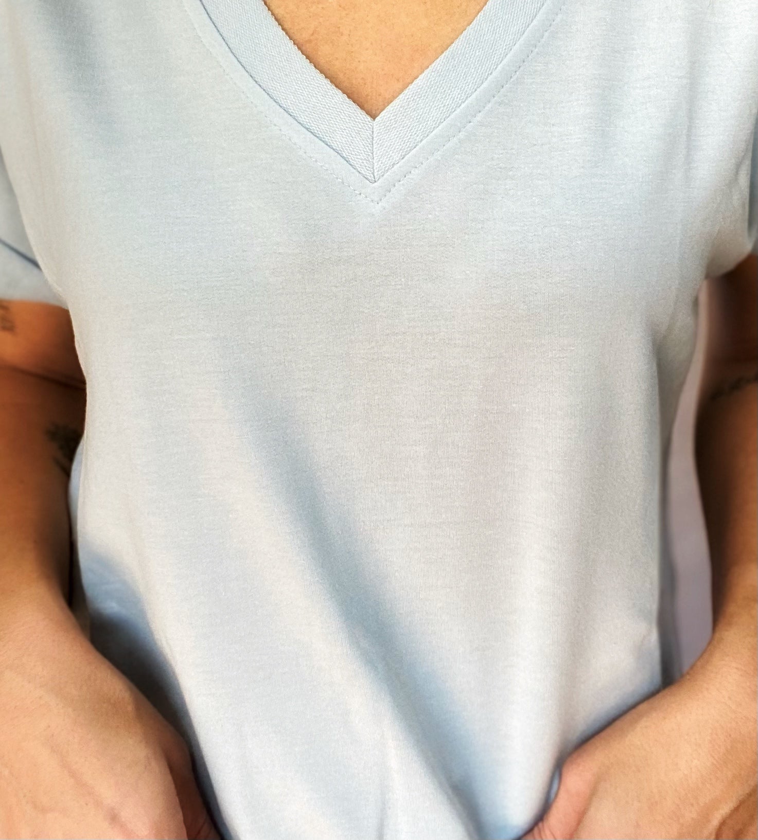 Boxy V- neck bodysuit for the perfect look. Pair it with jeans, shorts or joggers. Loose up top for the look and feel of pure comfort. Folded short sleeves. 95% Polyester, 5% Spandex.