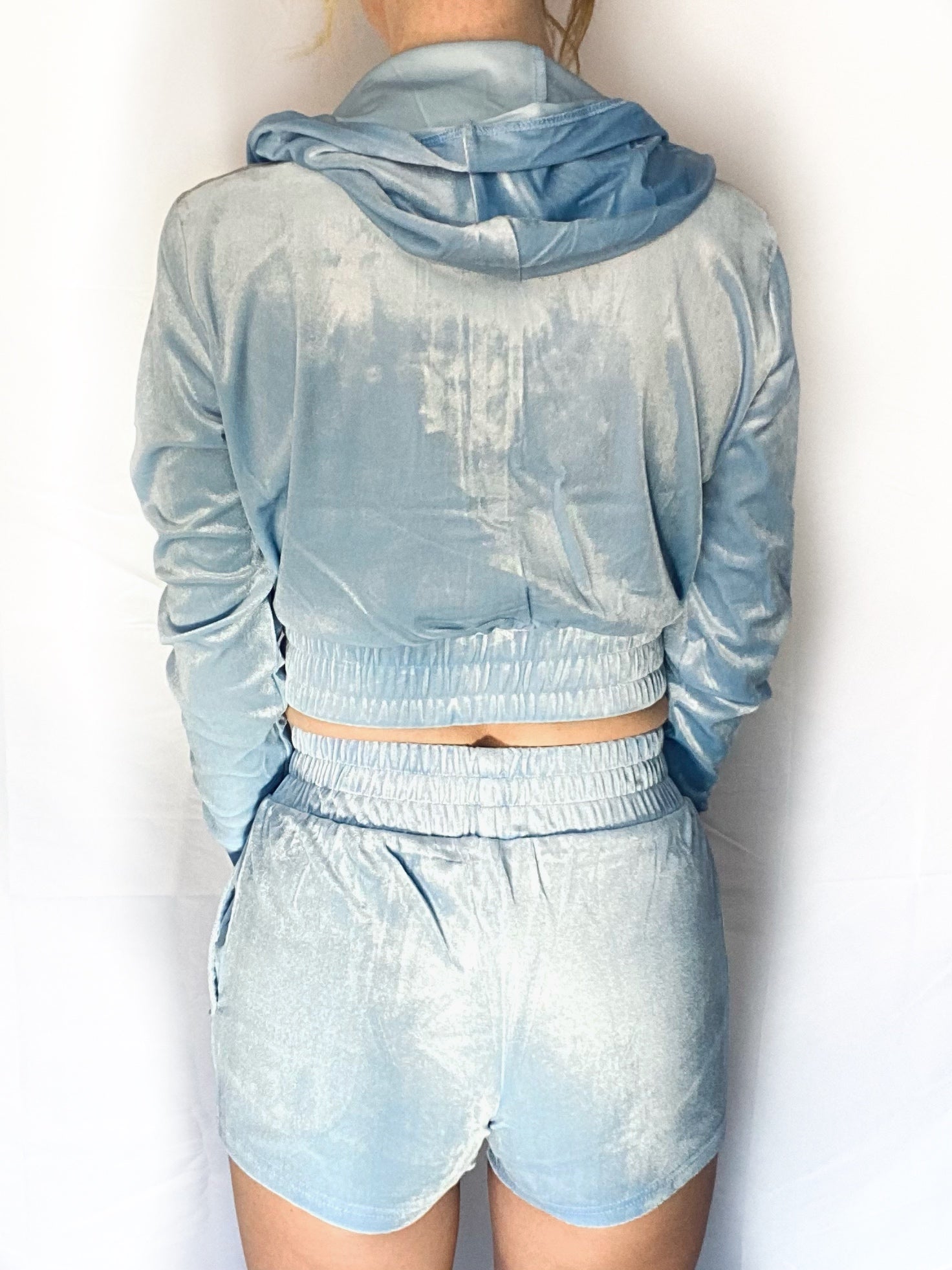 Solid crop velour zip up hoodie with a front zipper closure. Zip up- 93% Polyester, 7% Spandex.