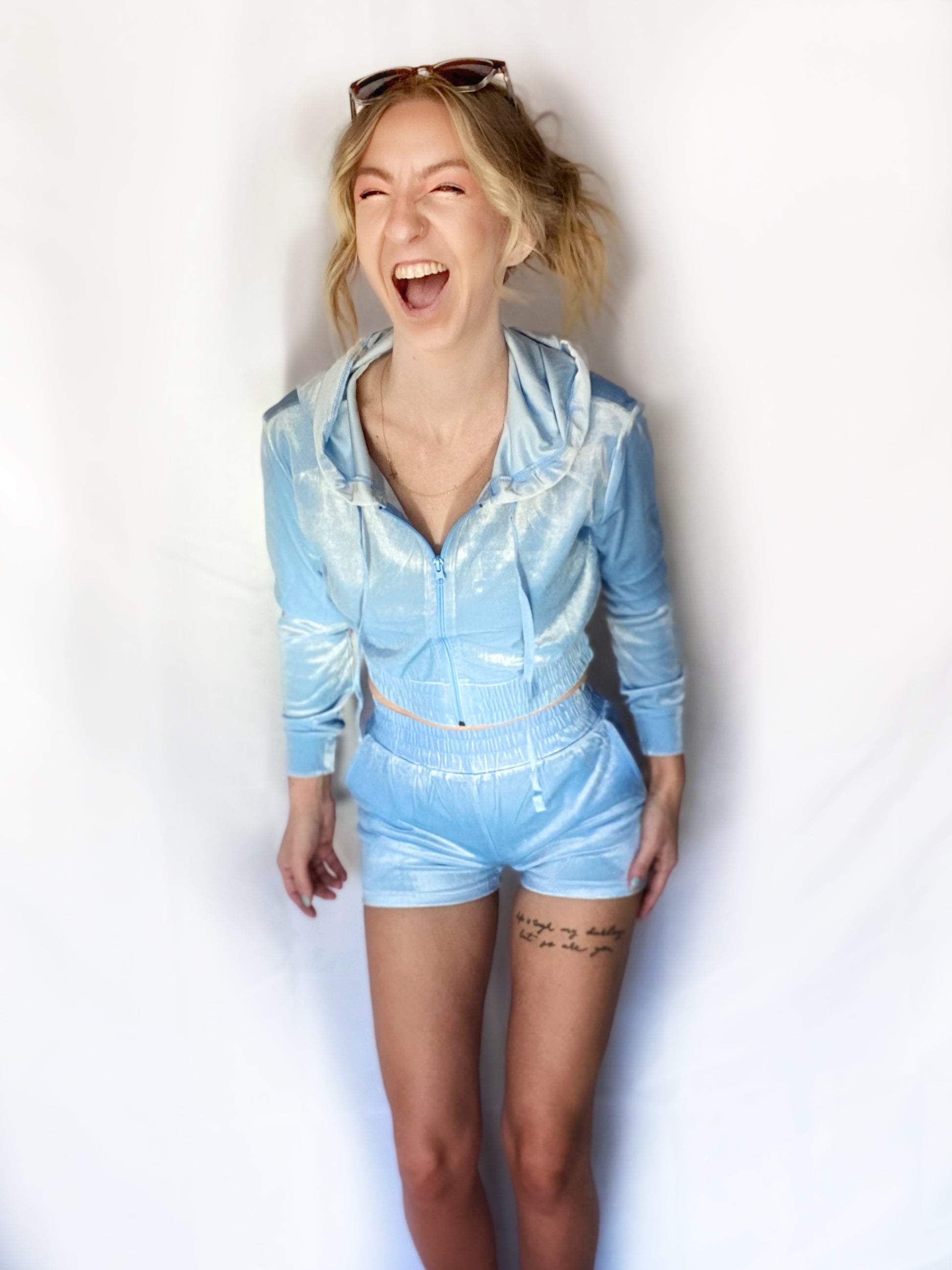 If this look could talk, it would never stop! You have officially found your favorite outfit. Matching zip up hoodie and shorts. Cute, sassy and a fun throwback to some of our best days are now back in style.