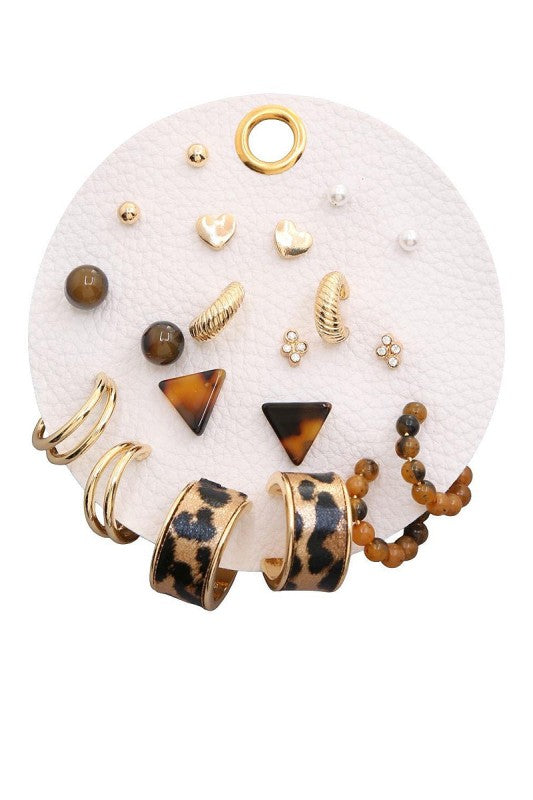 Unleash your bold side with the Wild Elegance Earring Set — a versatile mix of post studs, hoops, and statement pieces designed to take you from everyday chic to night-out glam. Featuring leopard textured gold hoops, tortoise accents, dainty studs, and beaded details, this set gives you endless styling options in one collection.