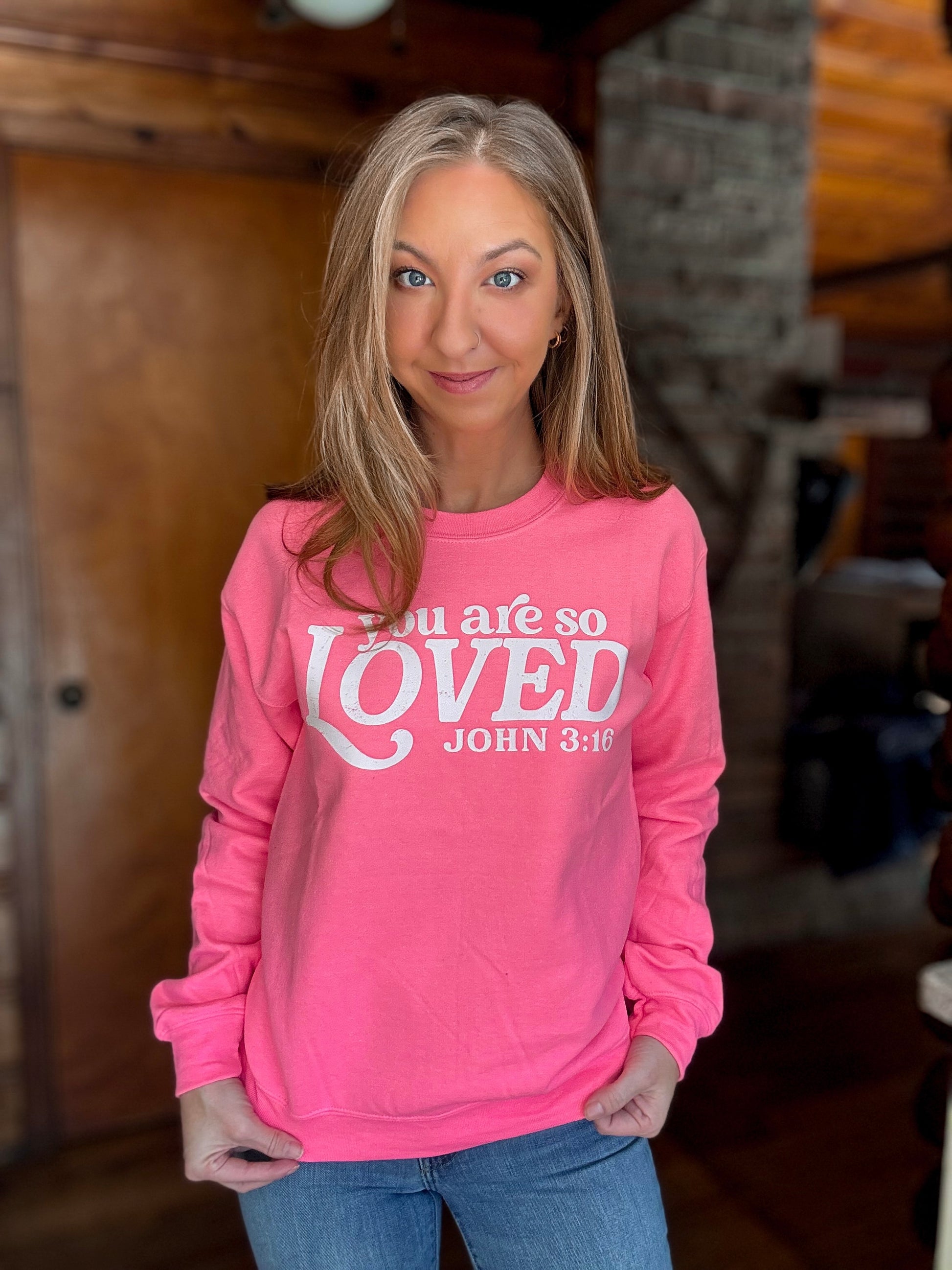 A bold reminder you can actually feel. This hot pink poly-cotton blend sweatshirt is soft, cozy, and made to be lived in. Featuring “You Are So Loved” with John 3:16, it’s more than a sweatshirt, it’s a message you carry with you and share without saying a word!